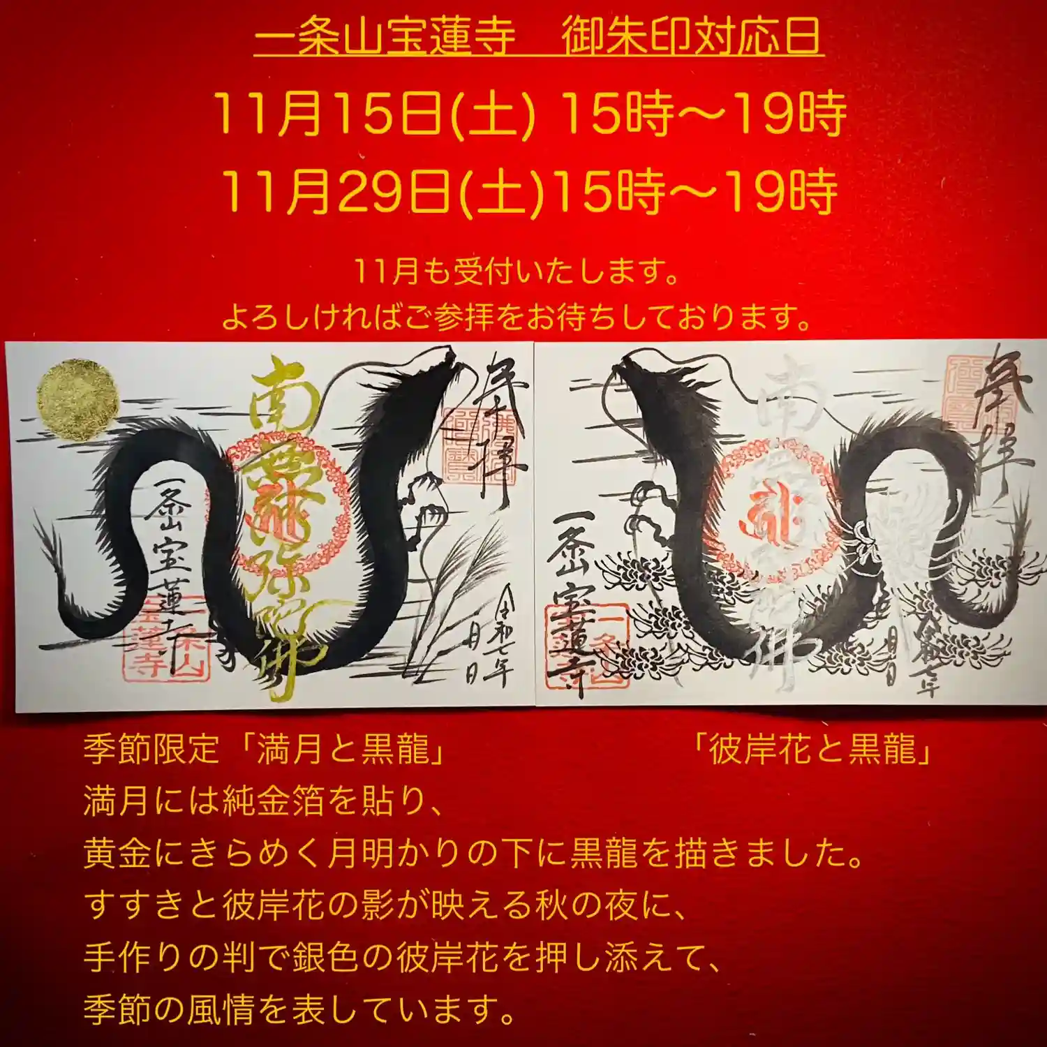 一条山宝蓮寺の9月・10月の限定御朱印をご紹介いたします。毎年お寺に咲く彼岸花を参考に判子を手掘り…