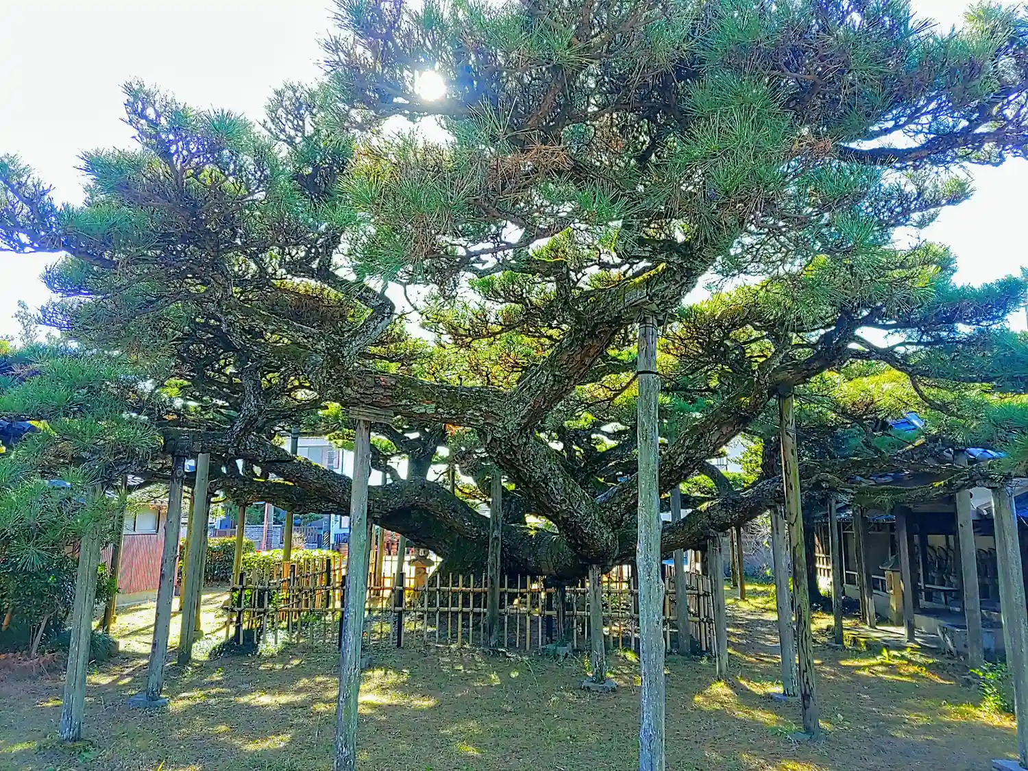一般的に、マツの主幹は地面から垂直に伸びるのですが、 このマツは高さ1.5mのところから北西、南、東の3方向に分かれて横に伸びています。 この樹形が、 雲を得てまさに天に昇ろうとする竜を連想させることから、「雲竜の松」と呼ばれています。樹齢から、このマツは助太夫のころからの ものと考えられます。 |