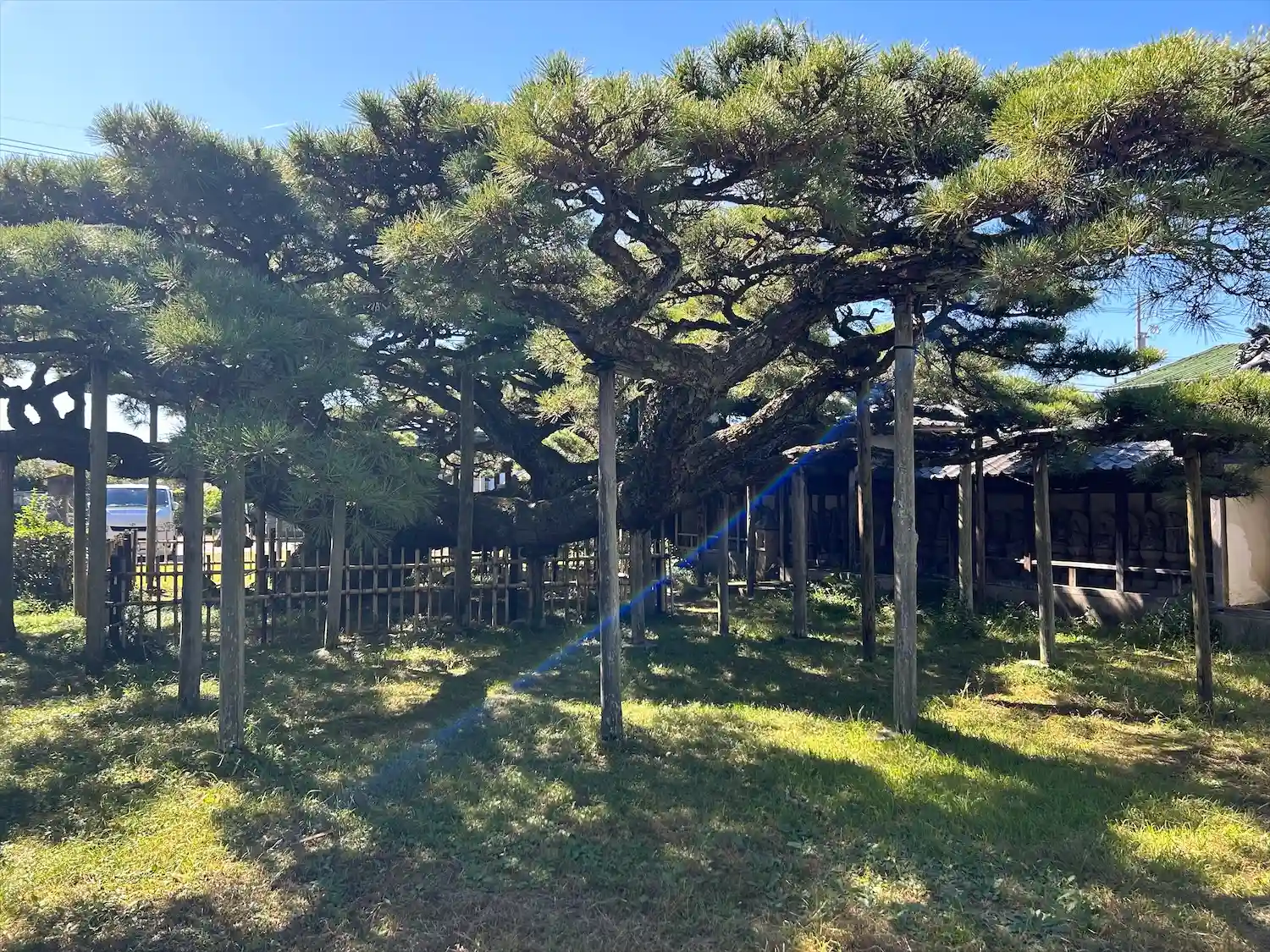 一般的に、マツの主幹は地面から垂直に伸びるのですが、 このマツは高さ1.5mのところから北西、南、東の3方向に分かれて横に伸びています。 この樹形が、 雲を得てまさに天に昇ろうとする竜を連想させることから、「雲竜の松」と呼ばれています。樹齢から、このマツは助太夫のころからの ものと考えられます。