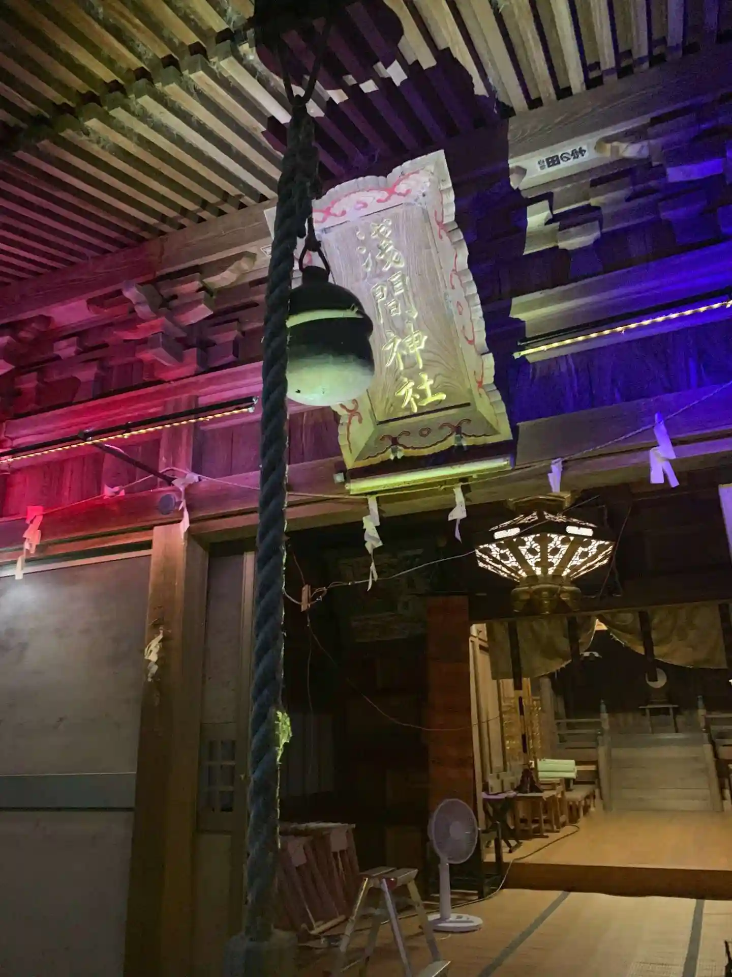 石階段の照明が替わっている、拝殿の照明が
