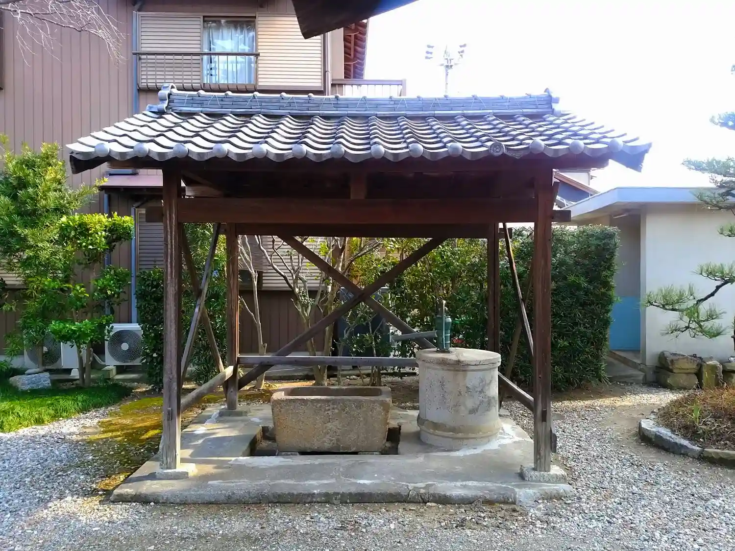 山門に石の仁王像があります。まだ新しい様で綺麗です。手水車は手押しの井戸です。