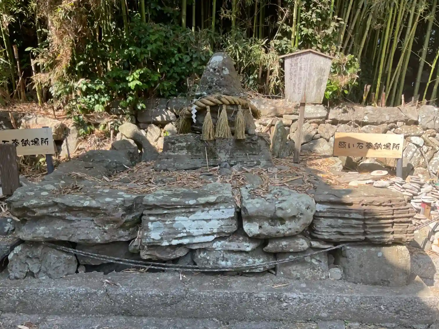 願い石の納め場所。真ん中は兜岩。武田信玄が兜をかぶせた岩。
