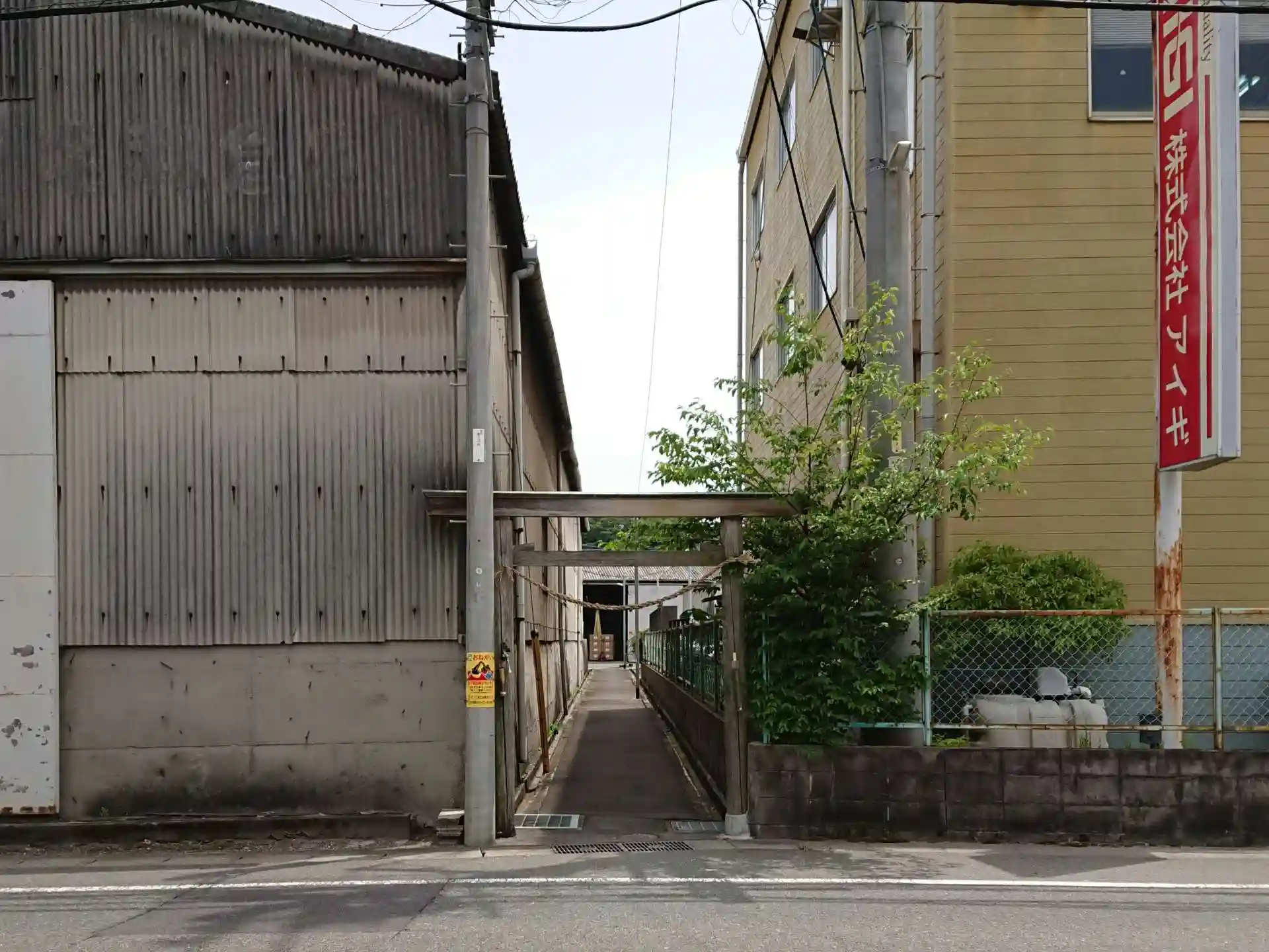 鳥居を見かけたのでくぐって行こうとしたら、正面に見えるのは工場。なかなか勇気がいります。入った先の左に社殿があります。通ったところは参道だと思われるけど、ほぼ工場のなかを通って行きます。プレハブの部屋では従業員が休憩していました。神社は立派でした。