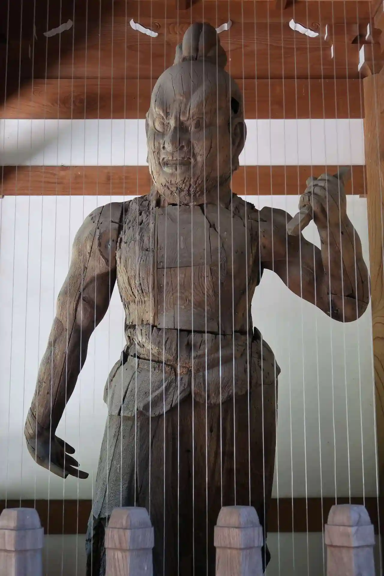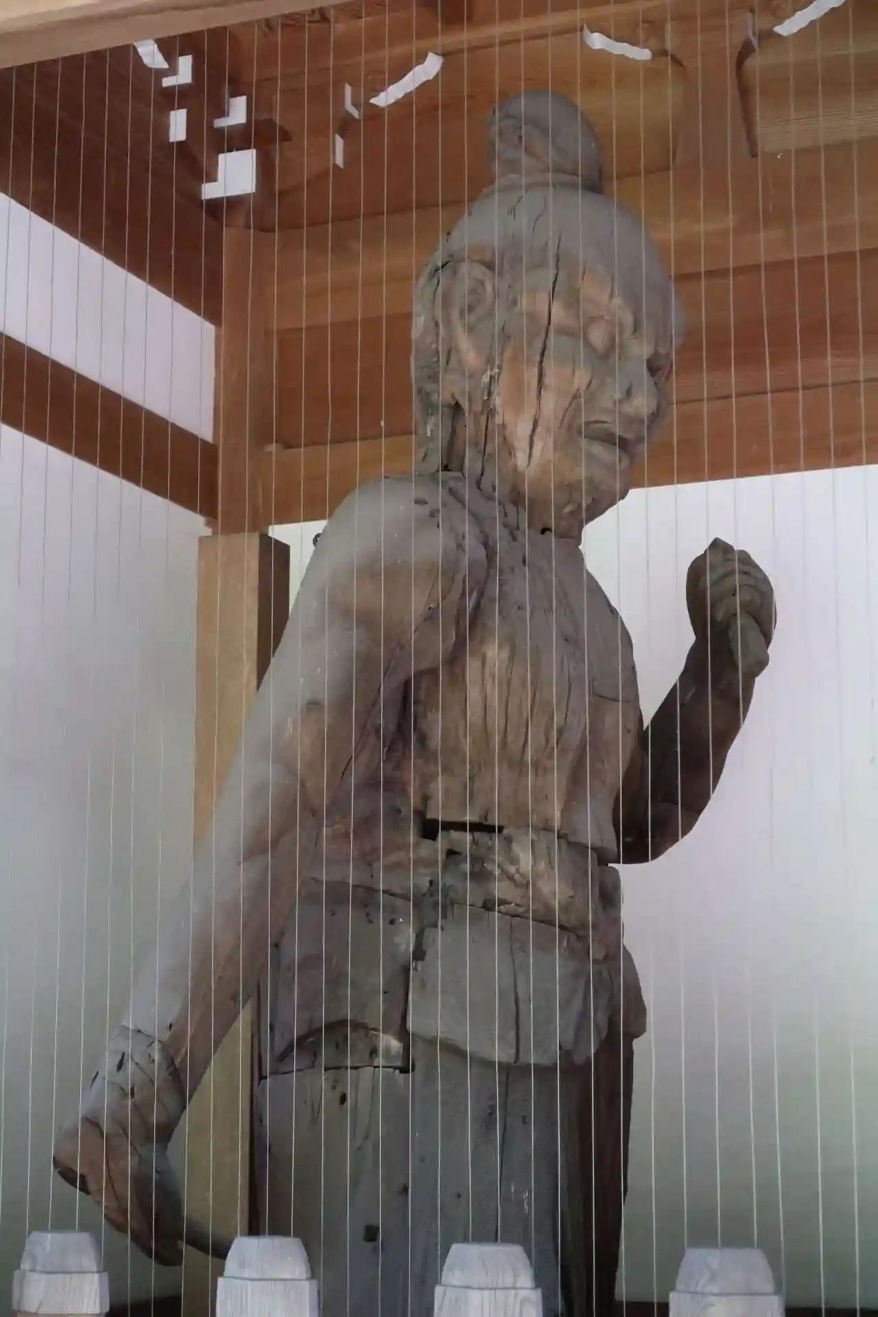 仁王門の表側に真新しい金剛力士立像(阿形、吽形)があり、裏側には市指定文化財の平安時代末期作の金剛力士立像がありました。高さ約2.73mと大きいですが、長年風雨に晒されてきたためかなり傷んでいます。これ以上酷くならない事を祈るばかりです。(金網があるのでピント合わせが難しい。)