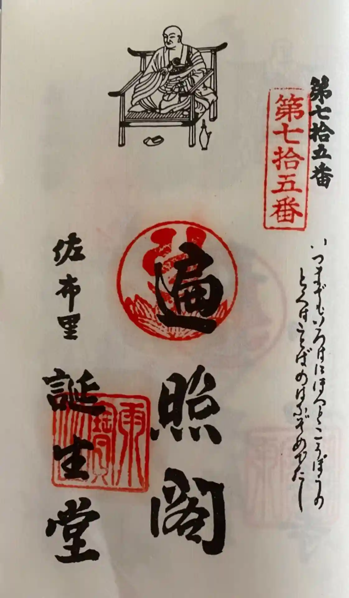 そこで、正法院の境内の山上に弘法大師像を奉安する御堂を建立し、この御堂を知多四国霊場七十五番札所としました。新しいお堂に札所を移す際、名称を本四国八十八ヶ所の七十五番札所「善通寺誕生所」に因んで「誕生堂」と称する事になったろうです。