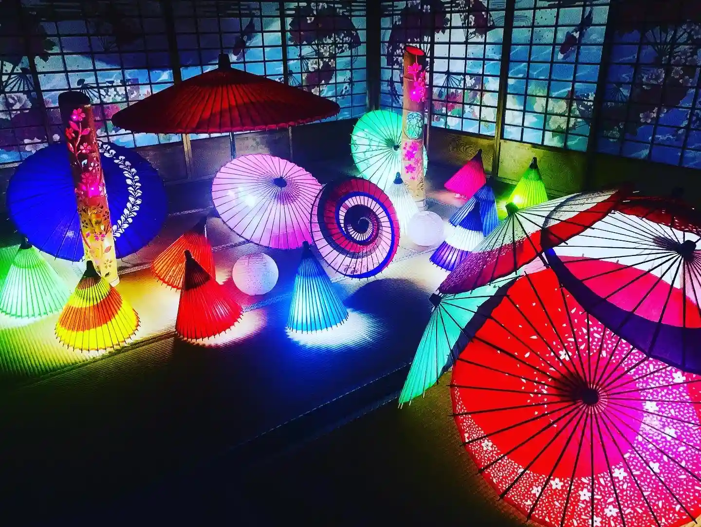 鯉と扇の障子の部屋和傘ライトアップ