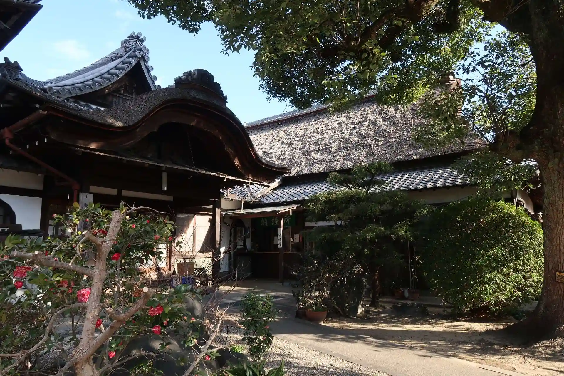 山門前に駐車場がありましたので停めさせて頂きました。境内の左側(西側)にもう1つの駐車場があります。山門は立派です。市指定文化財で江戸時代後期の1840年建立、楼上に文殊菩薩が安置されている事から文殊楼門と呼ぶそうです。門の左右には阿形と吽形ですが、凄味の無い可愛らしい金剛力士。山門をくぐると正面に本堂と思いきや、実は客殿で、本堂はその左側。その手前には手水と?堂。右側には鐘楼、庫裏・納経所です。