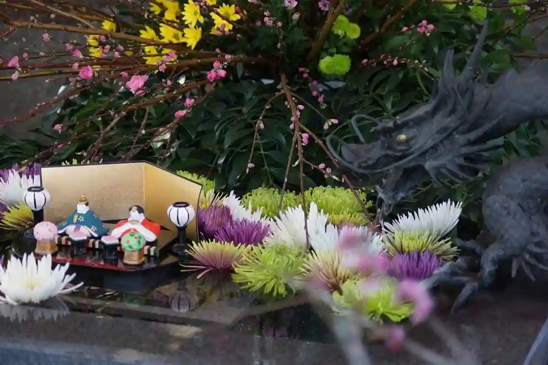 東海市大田町の神谷生花さんが「桃の節句」の花手水を生け込み奉納しているところを発見にゃん!