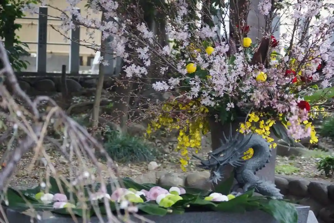 東海市大田町の神谷生花さんが「お花見」をテーマに花手水を生け込みをしているところを発見したにゃん。