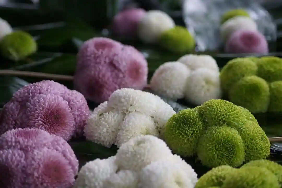「はらん」の上には、お花で作った美味しそうなお団子が…つい手を伸ばそうとしたら、神主さんに見つかって怒られたにゃん。