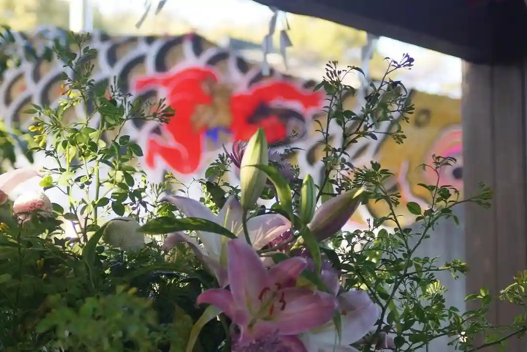 東海市大田町の神谷生花さんが「端午の節句」の花手水の生け込み奉納と飾り付けをしているところを発見したにゃん。