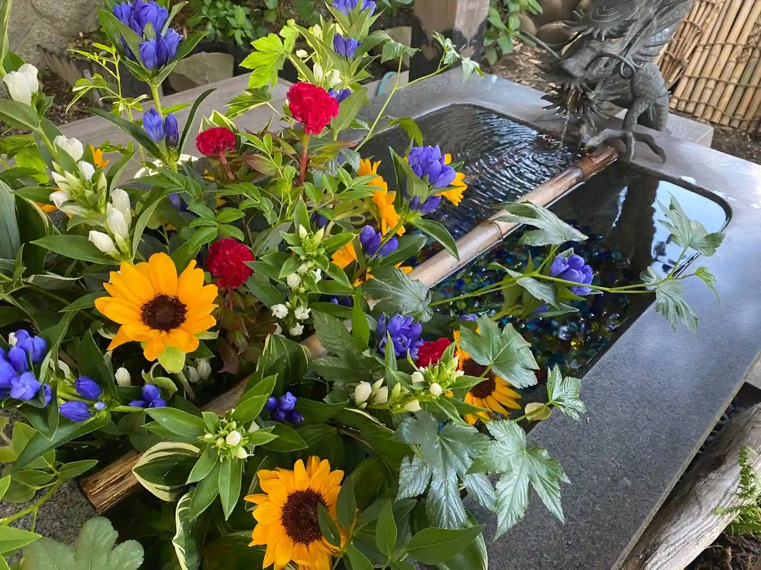東海市大田町の神谷生花さんが「盛夏」をテーマに花手水の生け込みをしているところを発見にゃん!