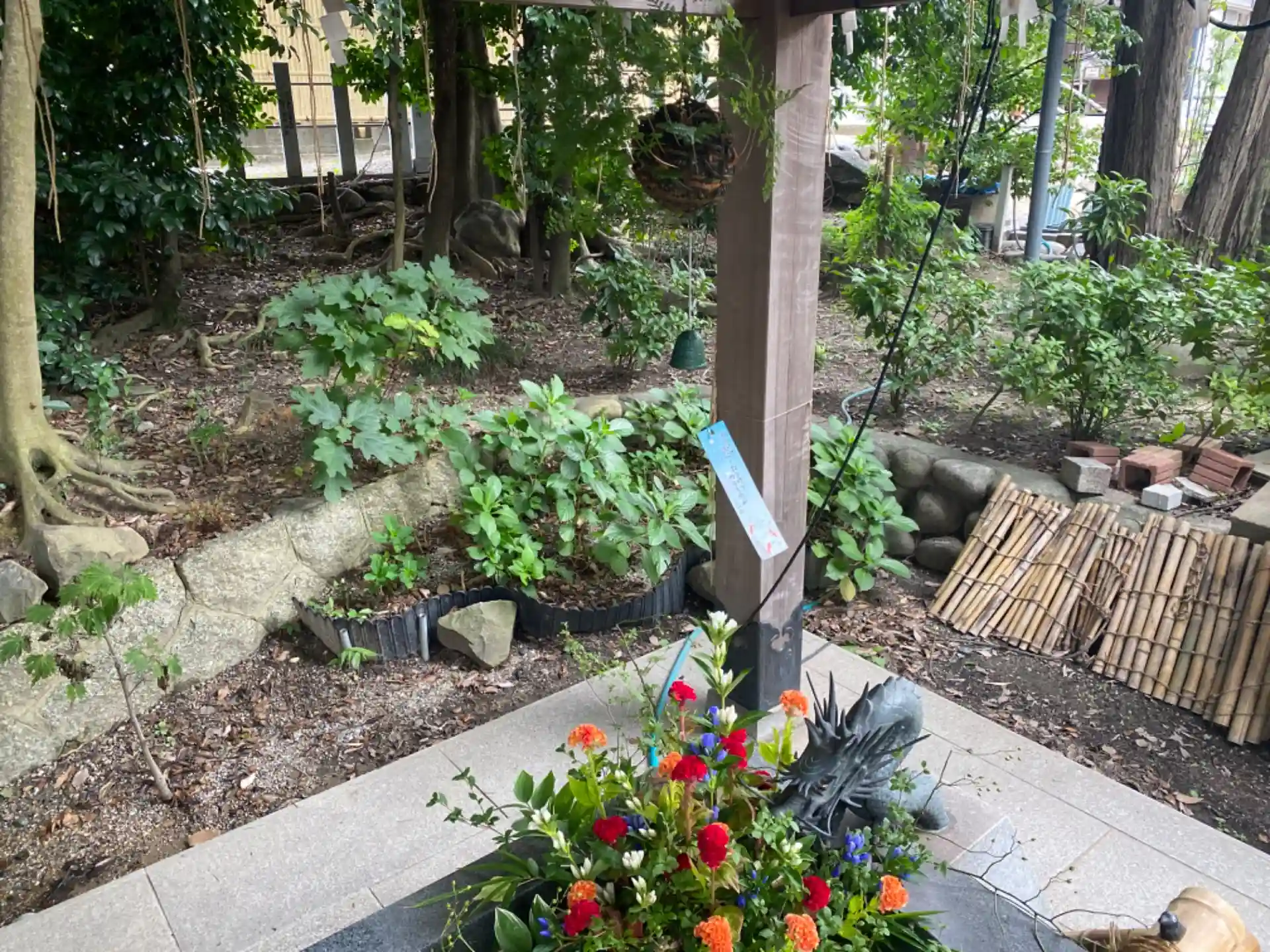 東海市大田町の神谷生花さんが「立秋」をテーマに花手水の生け込みをしているところを発見にゃん!