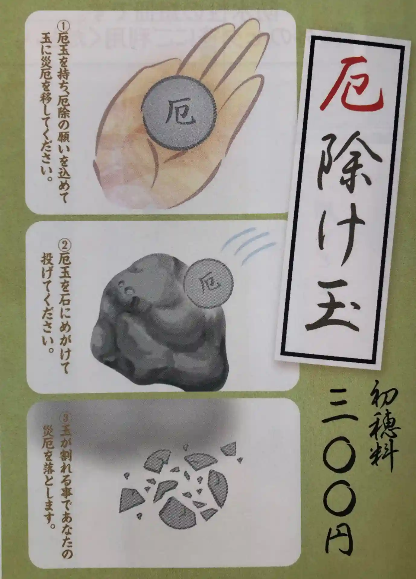 ご祈祷のあと、厄落とし神事として、「遠神笑美給(とおつ御祖の神、ほほ笑み給え)、招福開運厄落とし」と唱えながら、厄玉割りします。