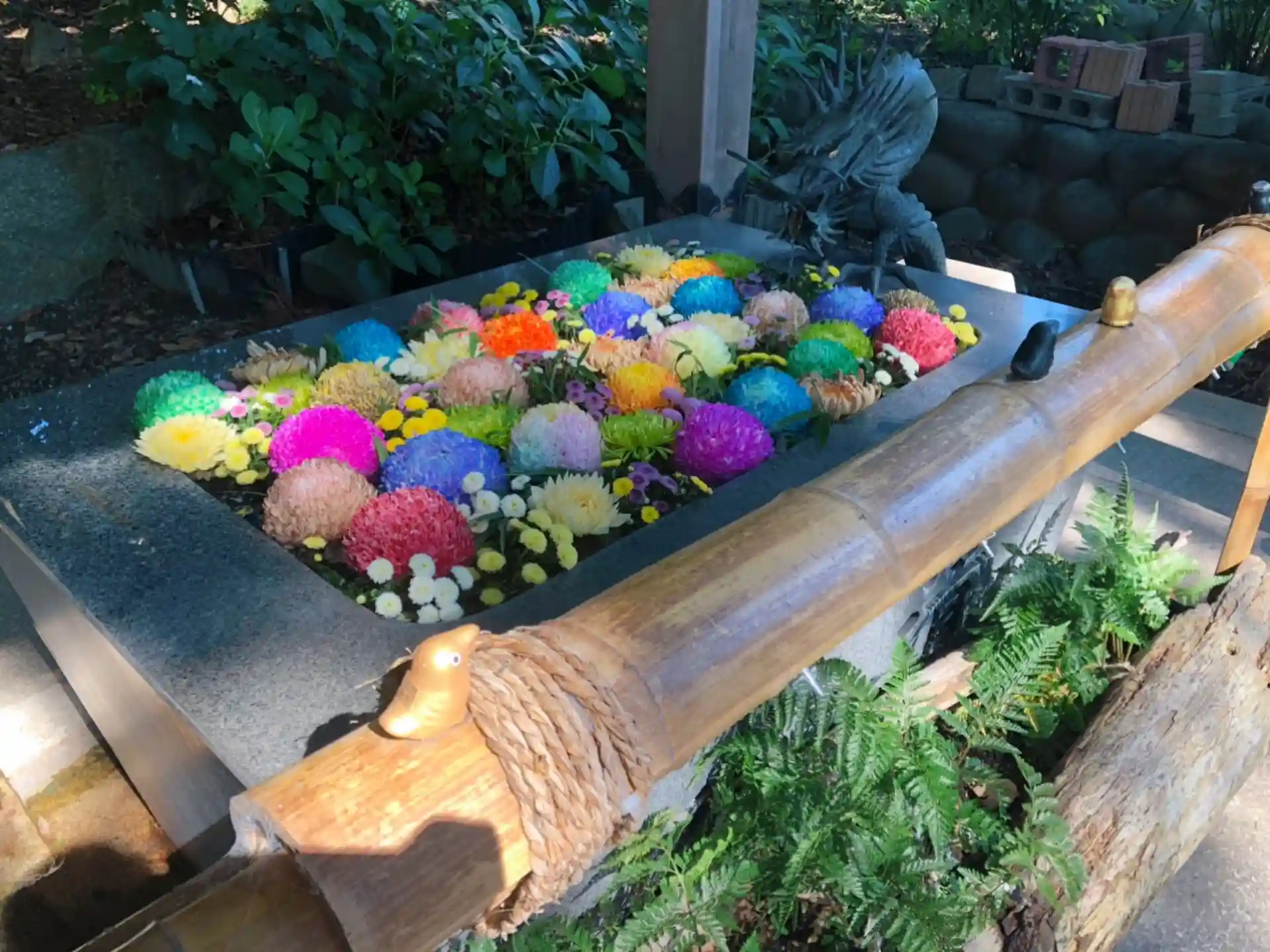 また、当社では、くまの七夕まつりとして、7月初旬から8月末の旧暦の七夕までお祝いさせていただいておりますが、七夕の五色の短冊に合わせて、カラフルな菊の花手水もご奉納賜りました。