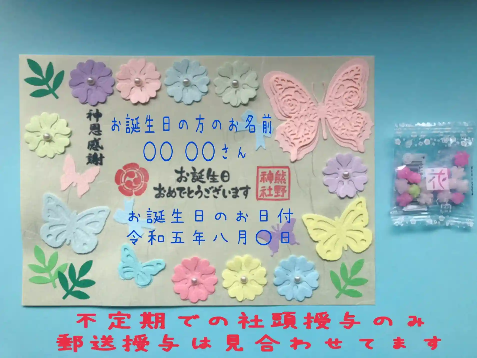 ※お誕生日の方のお名前とお日付をお入れしますので、参拝日はは入りませんので、ご注意ください。