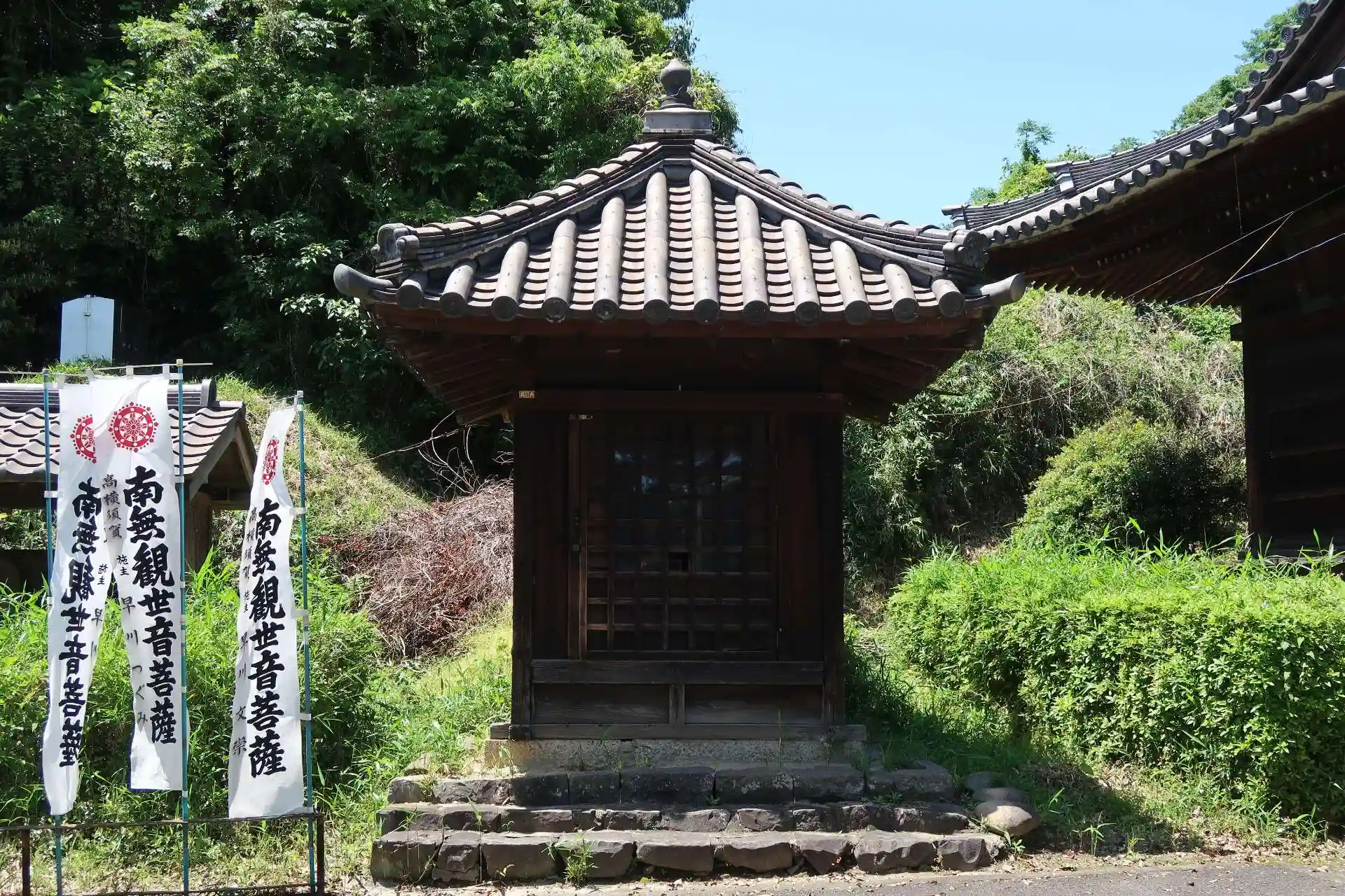 寺院石段の道路を挟んだ向かいの雨尾幼稚園の前に駐車場がありましたので停めさせて頂きました。短い石段を上がると左側に仁王門ですので、参道は直角に曲がります。仁王門には阿形、吽形の金剛力士像。仁王門をくぐり、石段を更に上がると正面に本堂です。本堂手前左側に手水、本堂左側に愛染明王や不動明王が祀られている愛染堂、その左側に三十三観音でした。(本堂の横まで車で来れるようです。ご年配の方用でしょうか。)本堂右側手前は庫裏(納経所)、本堂右側奥は客殿です。