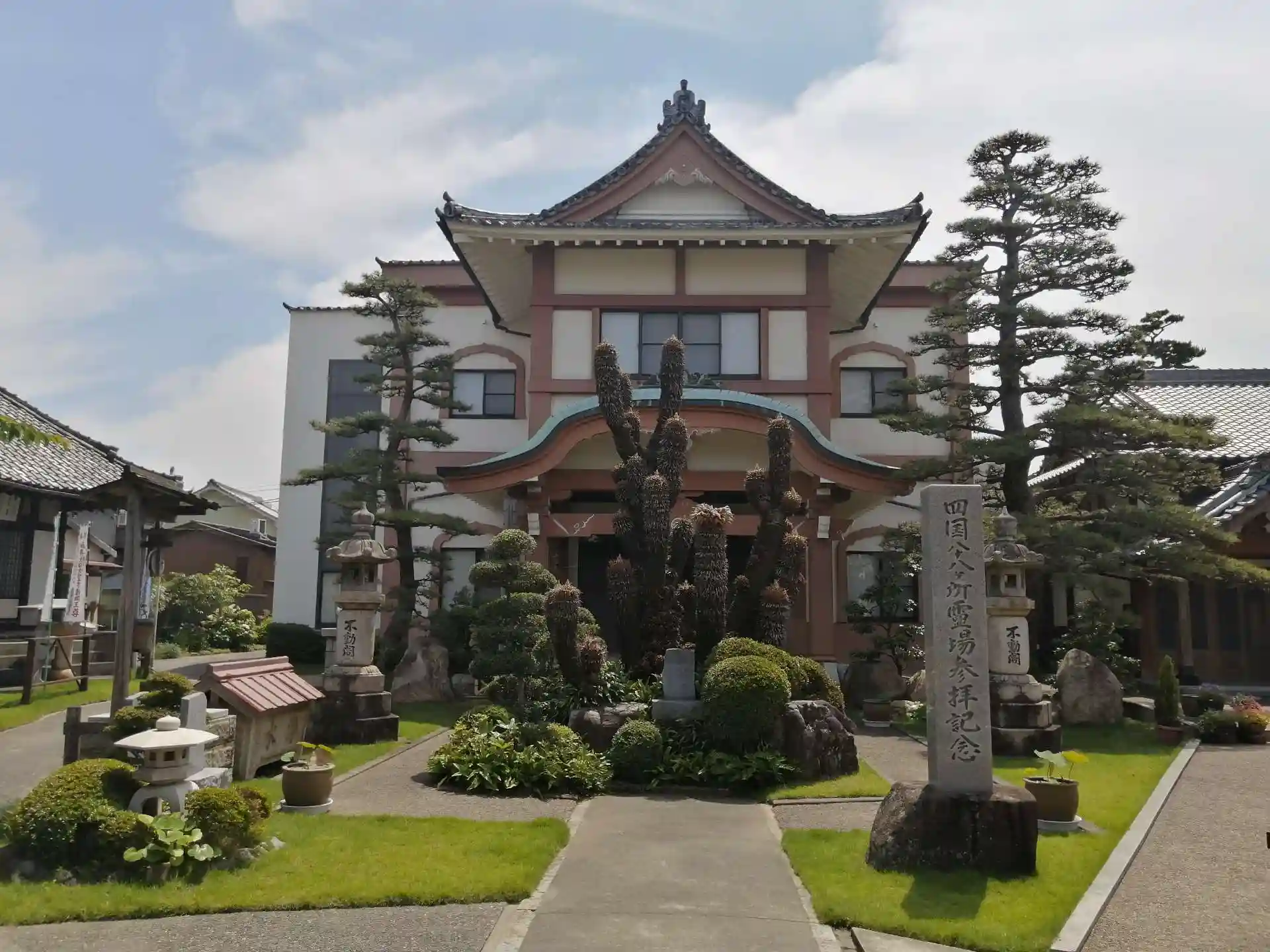 総門をくぐり少し先に山門(上層階に十六羅漢像が祀られているが未公開)。山門をくぐると正面に鉄筋コンクリート2階建の本堂。