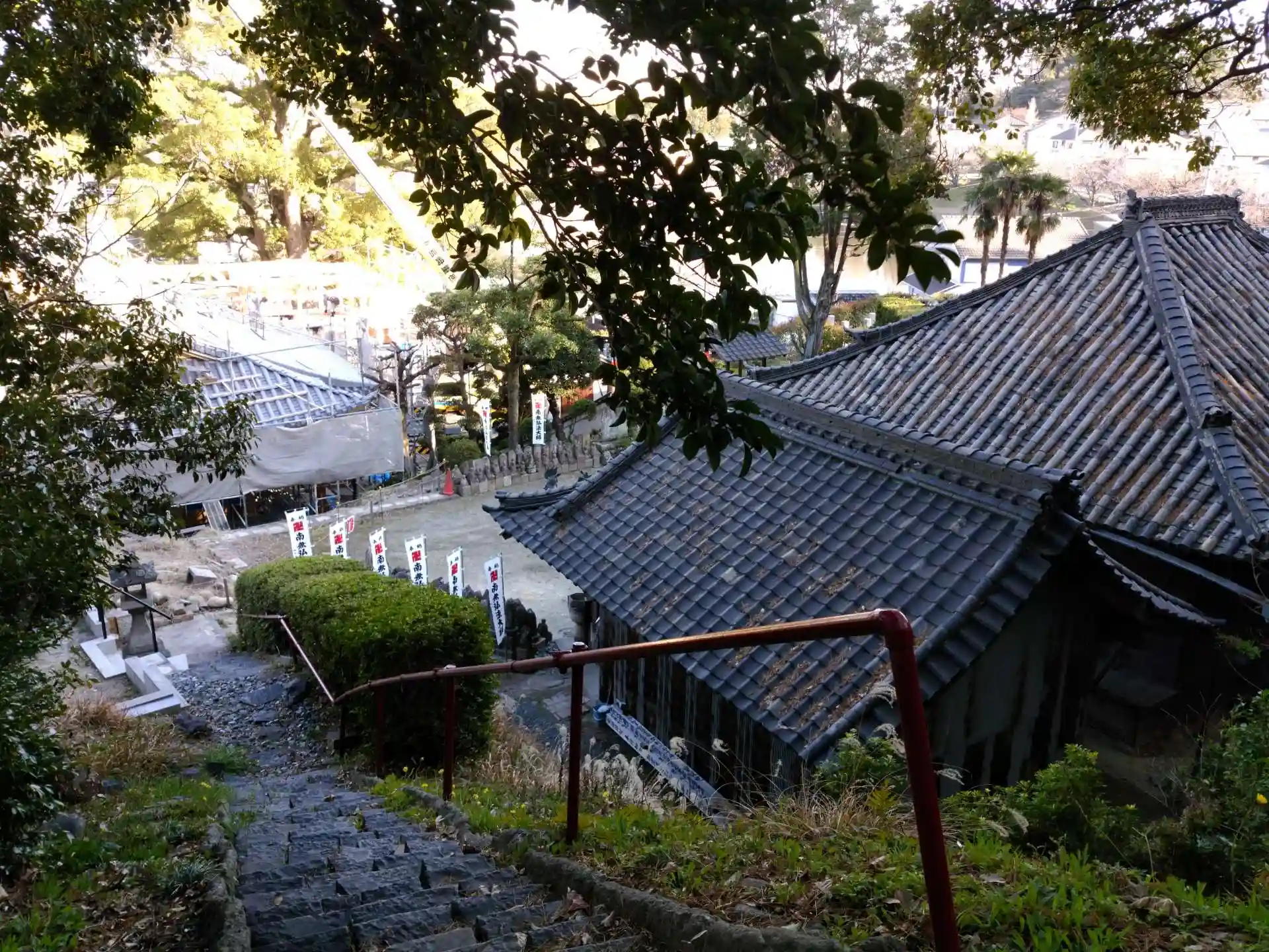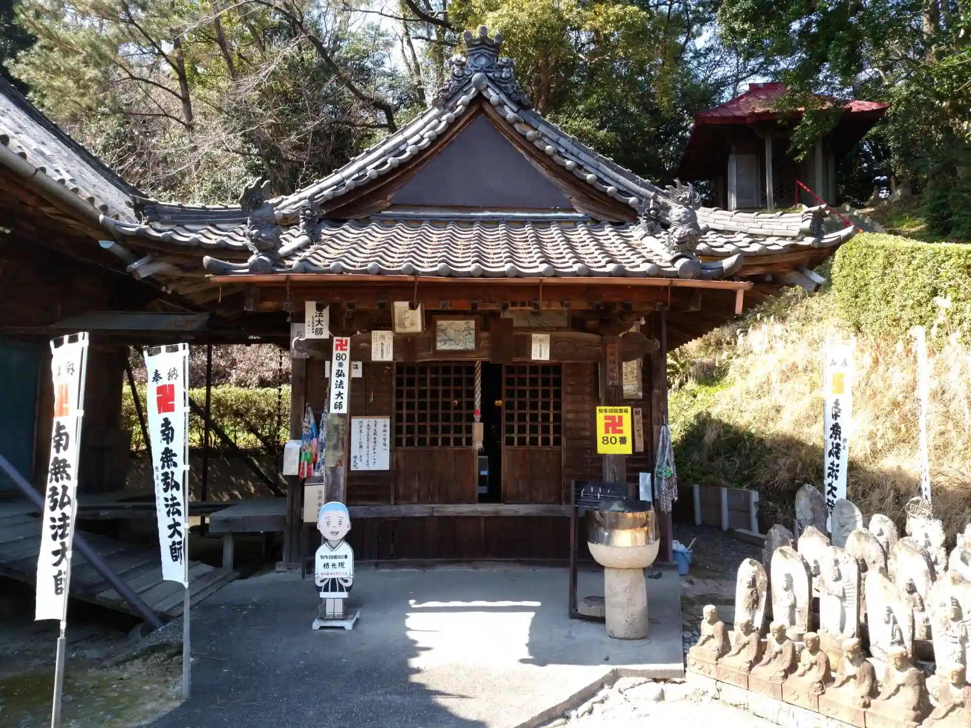 こうもり傘がぶら下がっています。実はこの傘「こうもり弘法」といいます。79番から80番の栖光院へ向かうのに近道をしようと裏山からやってきてバチがあたった横着者の傘だそうです。ショートカットはダメダメ。