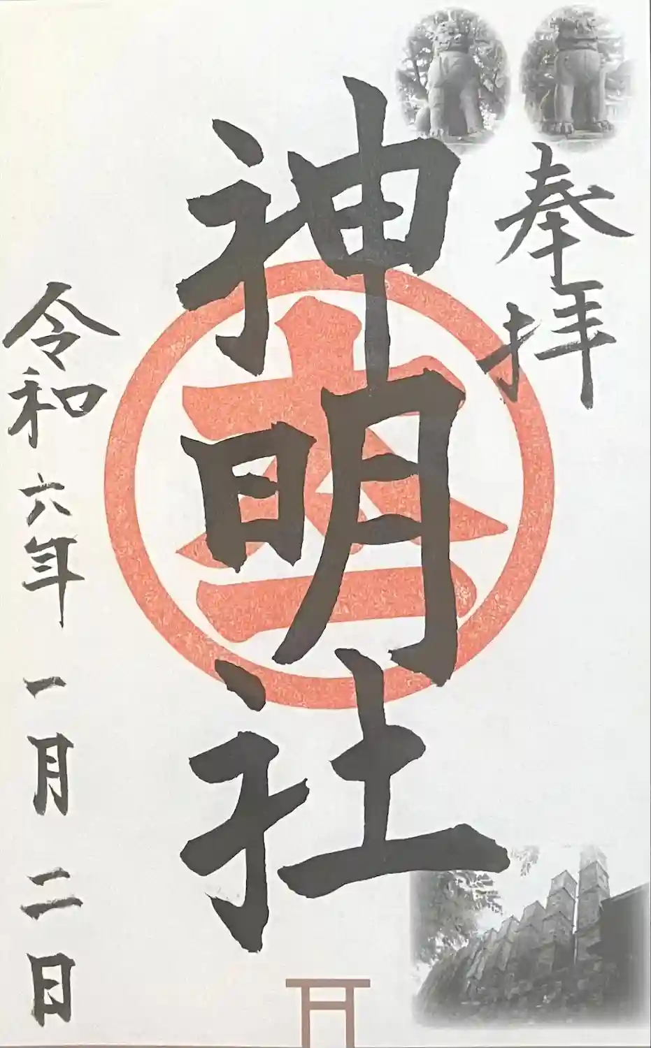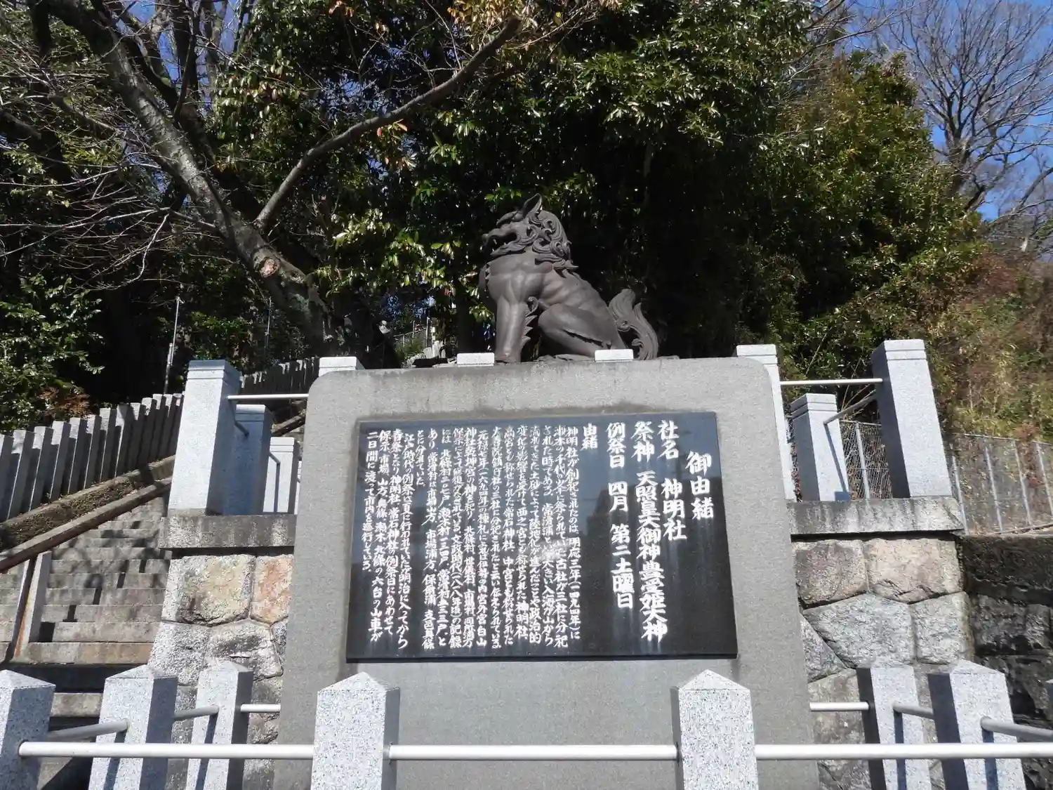 南側入口鳥居:後方の狛犬の大きさに驚きました。