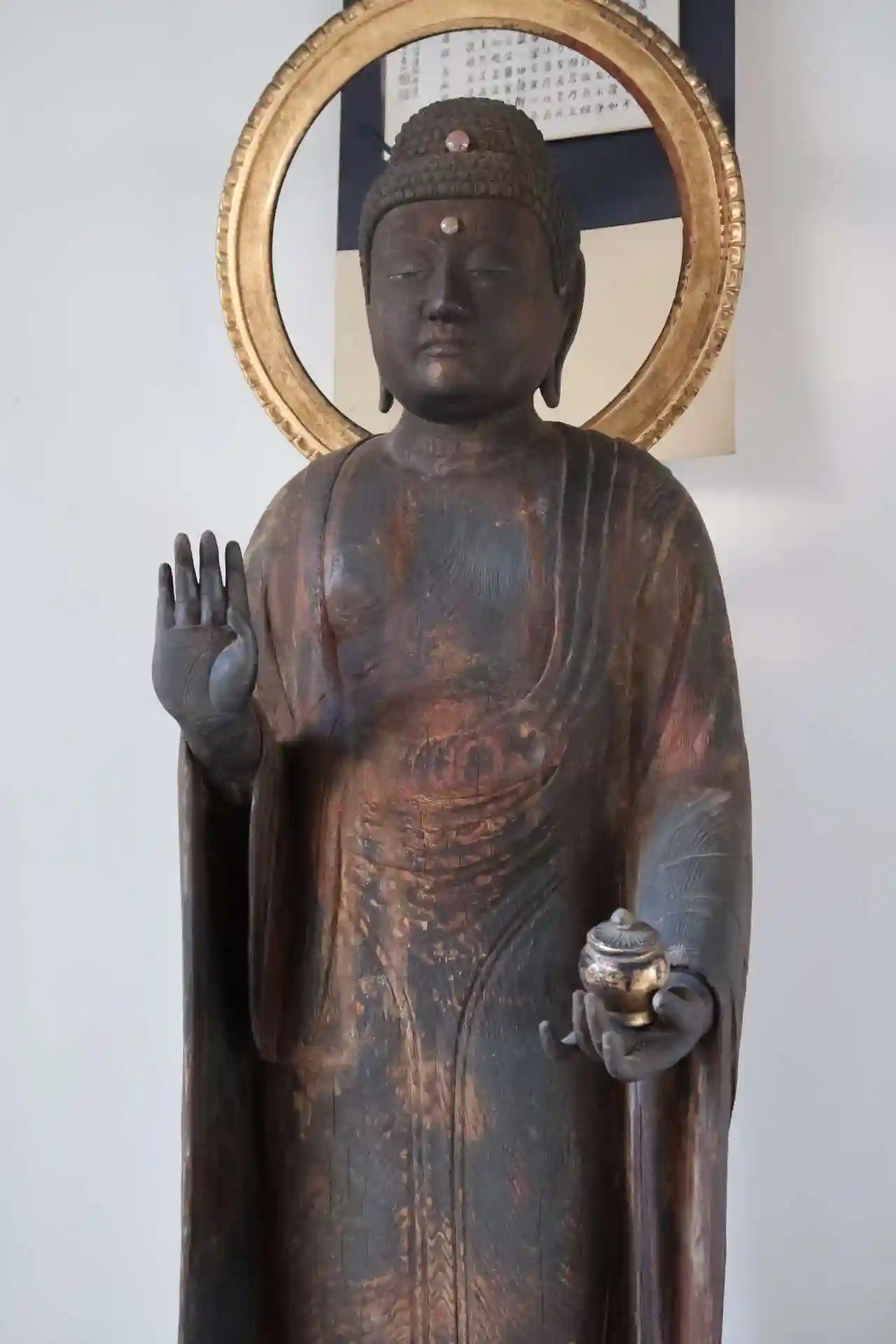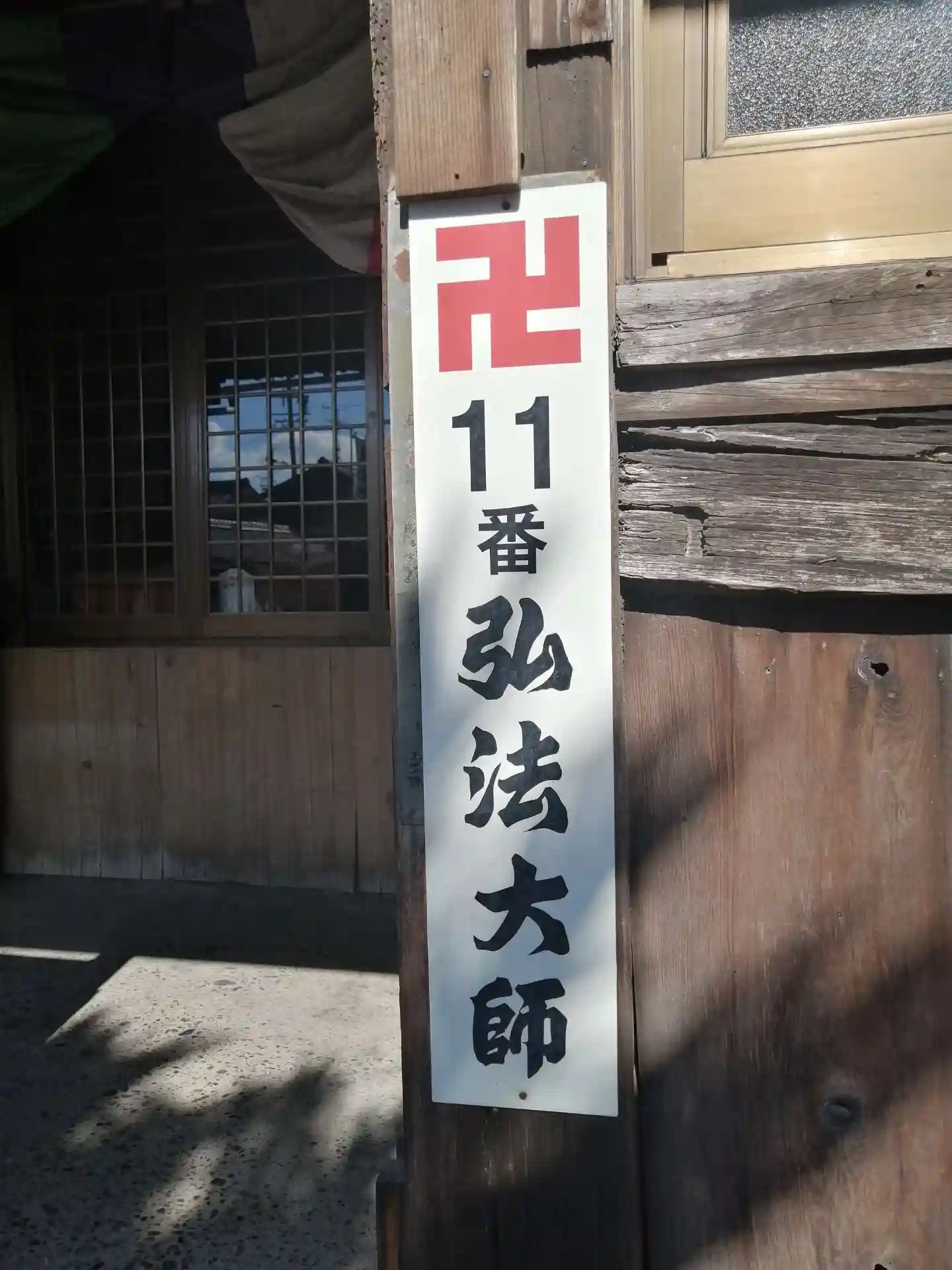 先ずは本堂、上がらせて頂いて本尊の釈迦三尊に手を合わせました。目を右の方へ移すと、右の脇間に厨子にも入らず、ポツンと仏像がありました。行ってみると町指定文化財の薬師如来立像です。高さ約97cm、鎌倉時代の作で、柔和ではなくしっかりとしたお顔付きでした。こちらの創建より以前の作なので何処かからか遷されたものと思われます。本堂から出て、弘法堂へ。お堂と言うより、本堂の一部の感じ。真ん中に弘法大師像、手を合わせました。