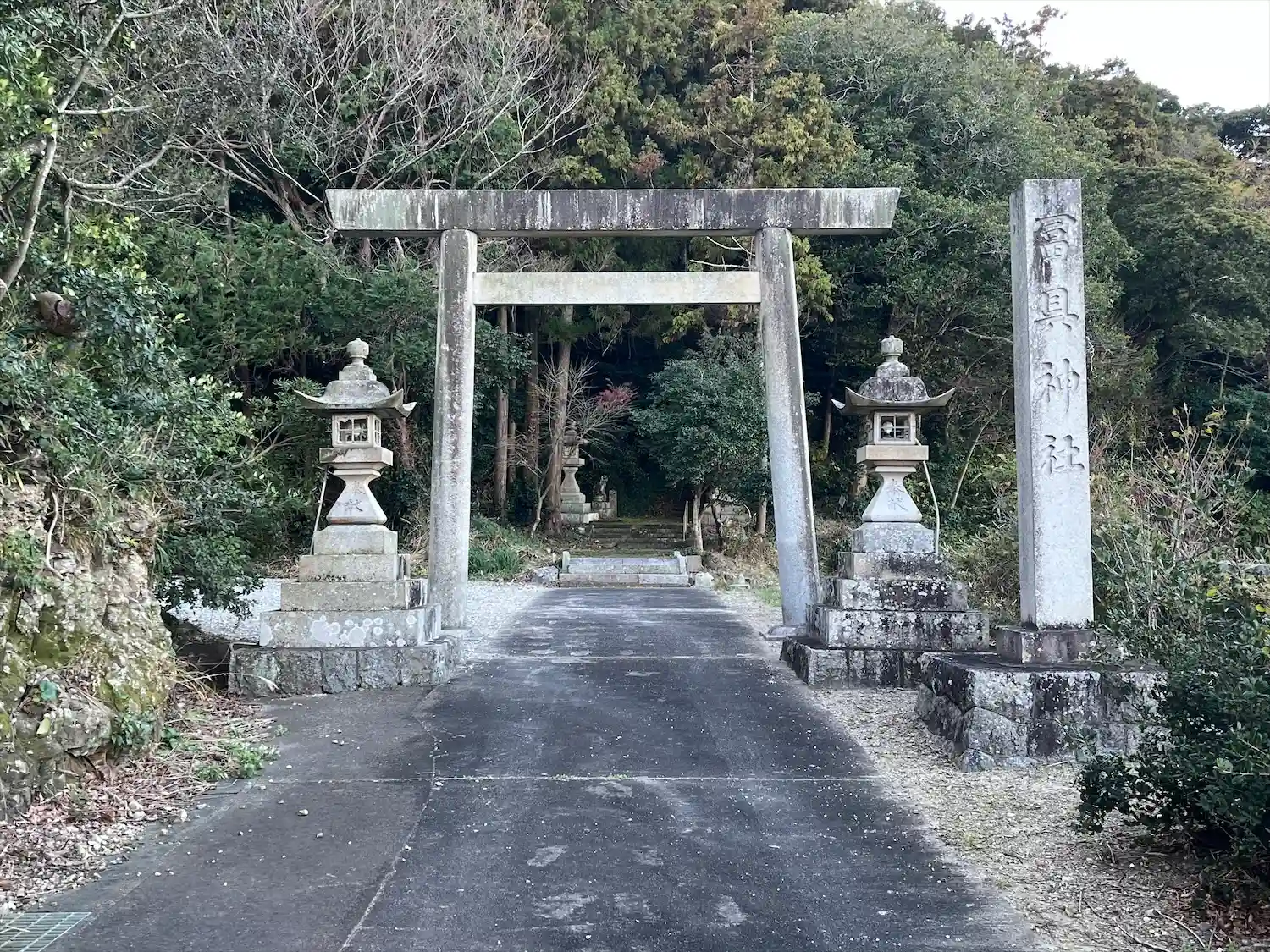 「冨具神社」の社号標ありました。山に向かって鳥居が建っています。