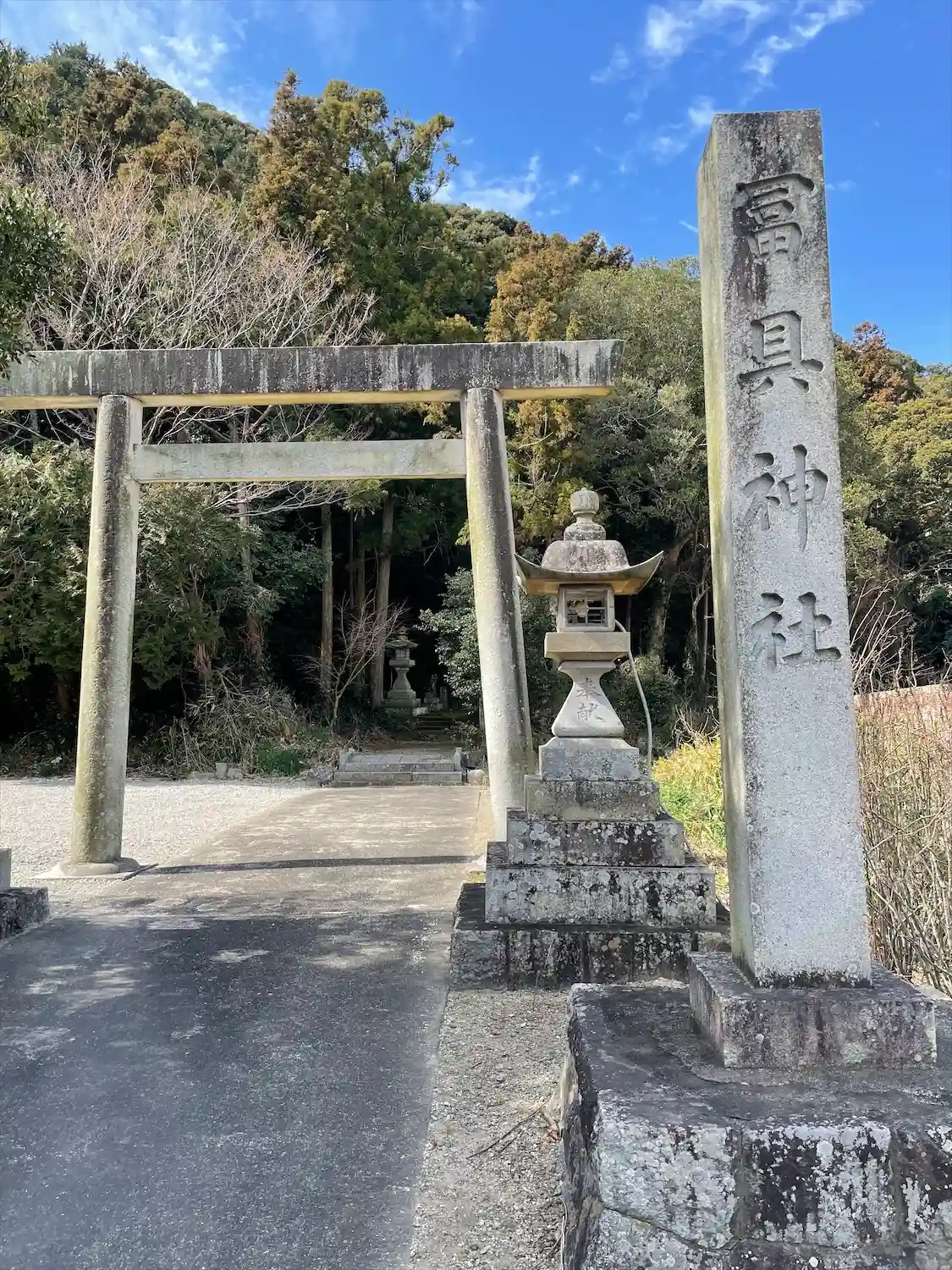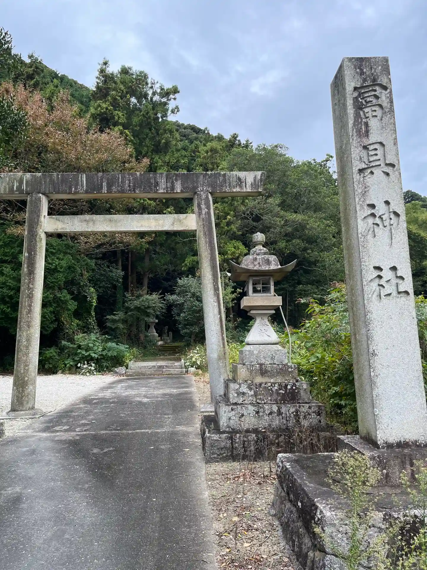 「冨具神社」の社号標ありました。山に向かって鳥居が建っています。