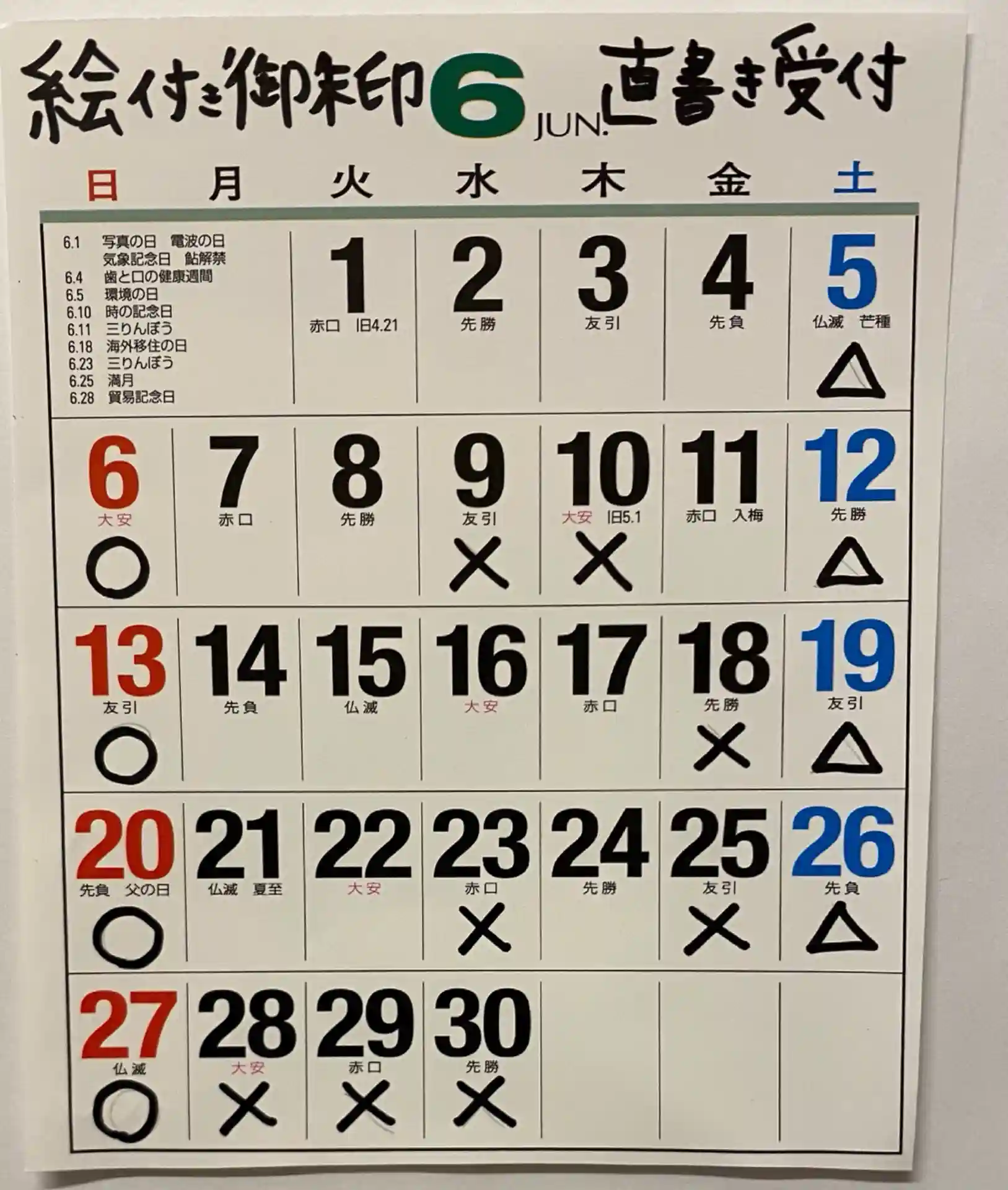 6月直書き受付日