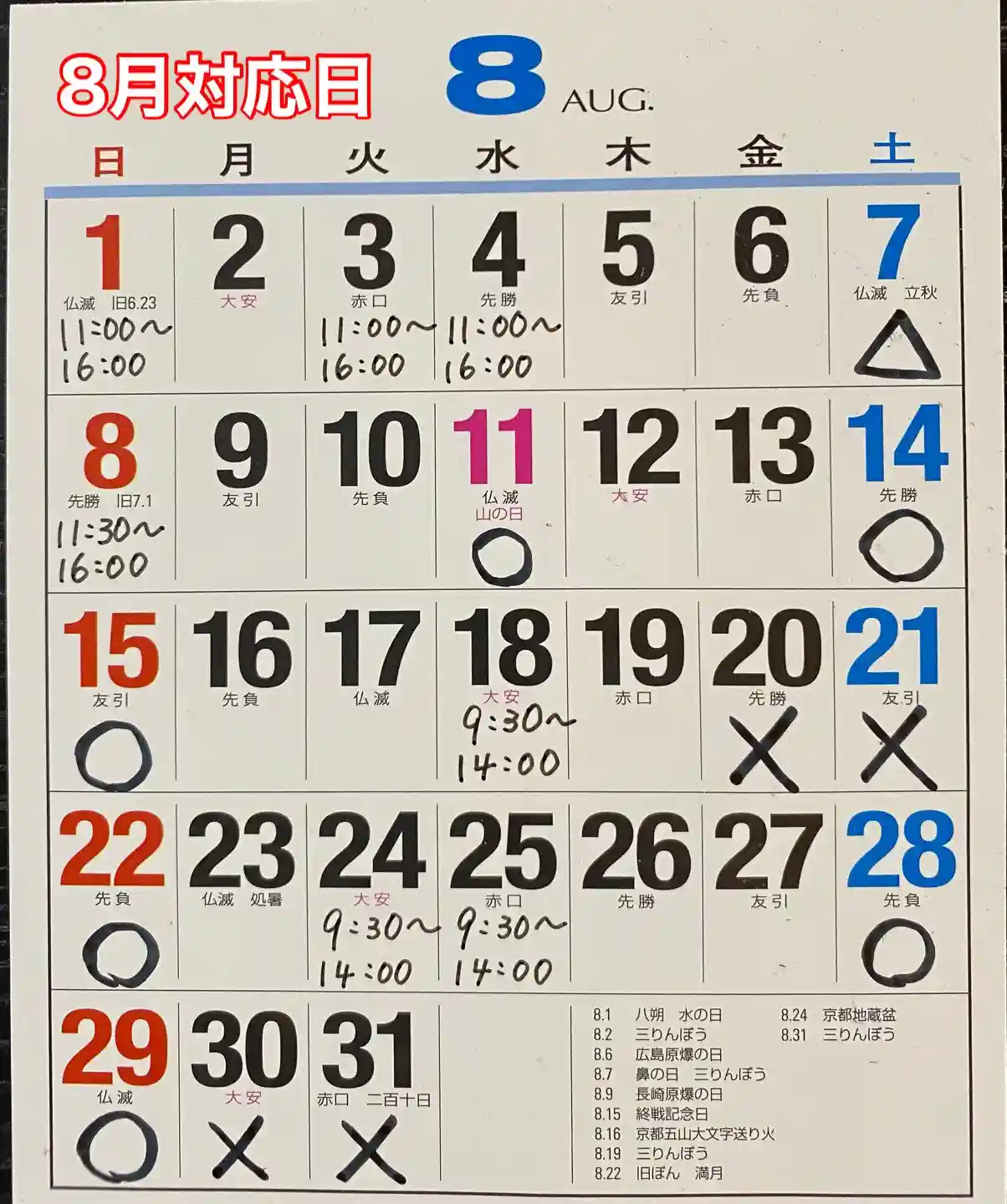 8月はお盆の行事、子供の夏休みの関係で対応時間が変わります。