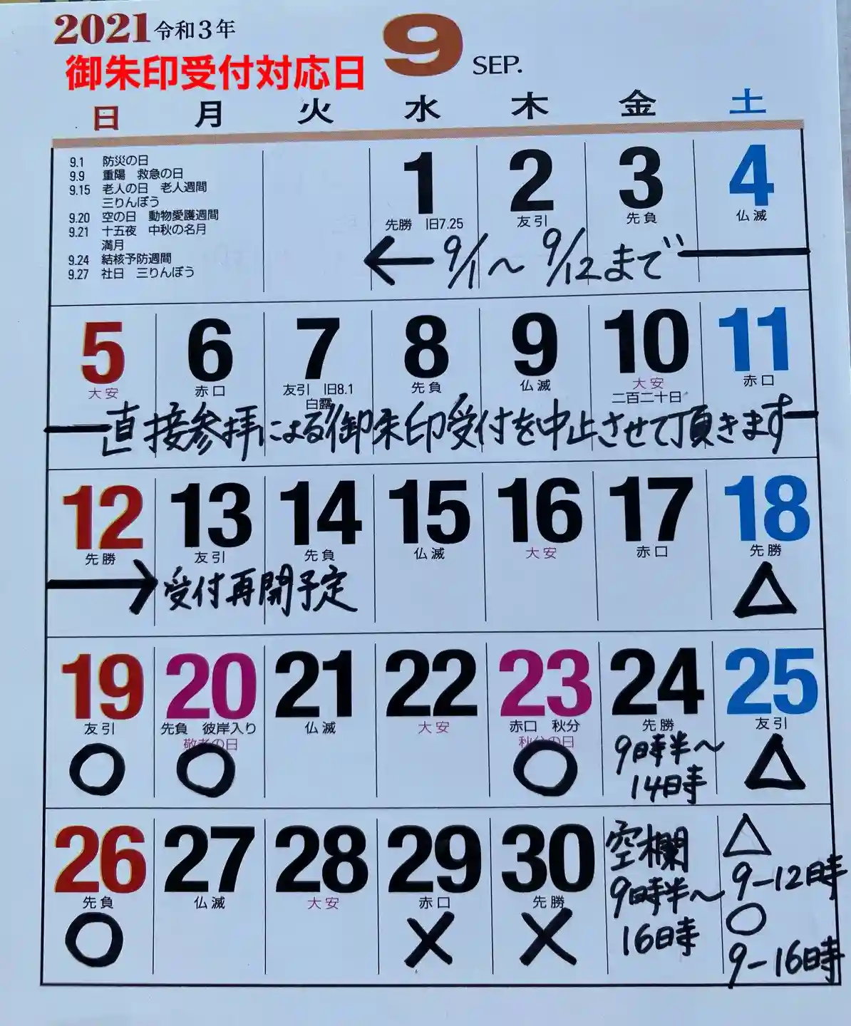 美浜町においても新型コロナウィルスによる感染者の増加が深刻な為、皆様の安全を第一に考え9月1日〜9月12日まで直接参拝による絵付き御朱印の直書き、書置き全ての御朱印の中止をさせていただきます。