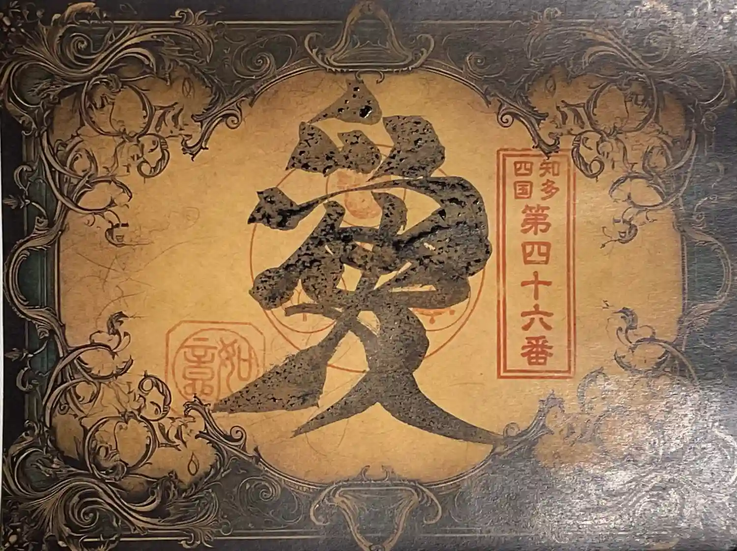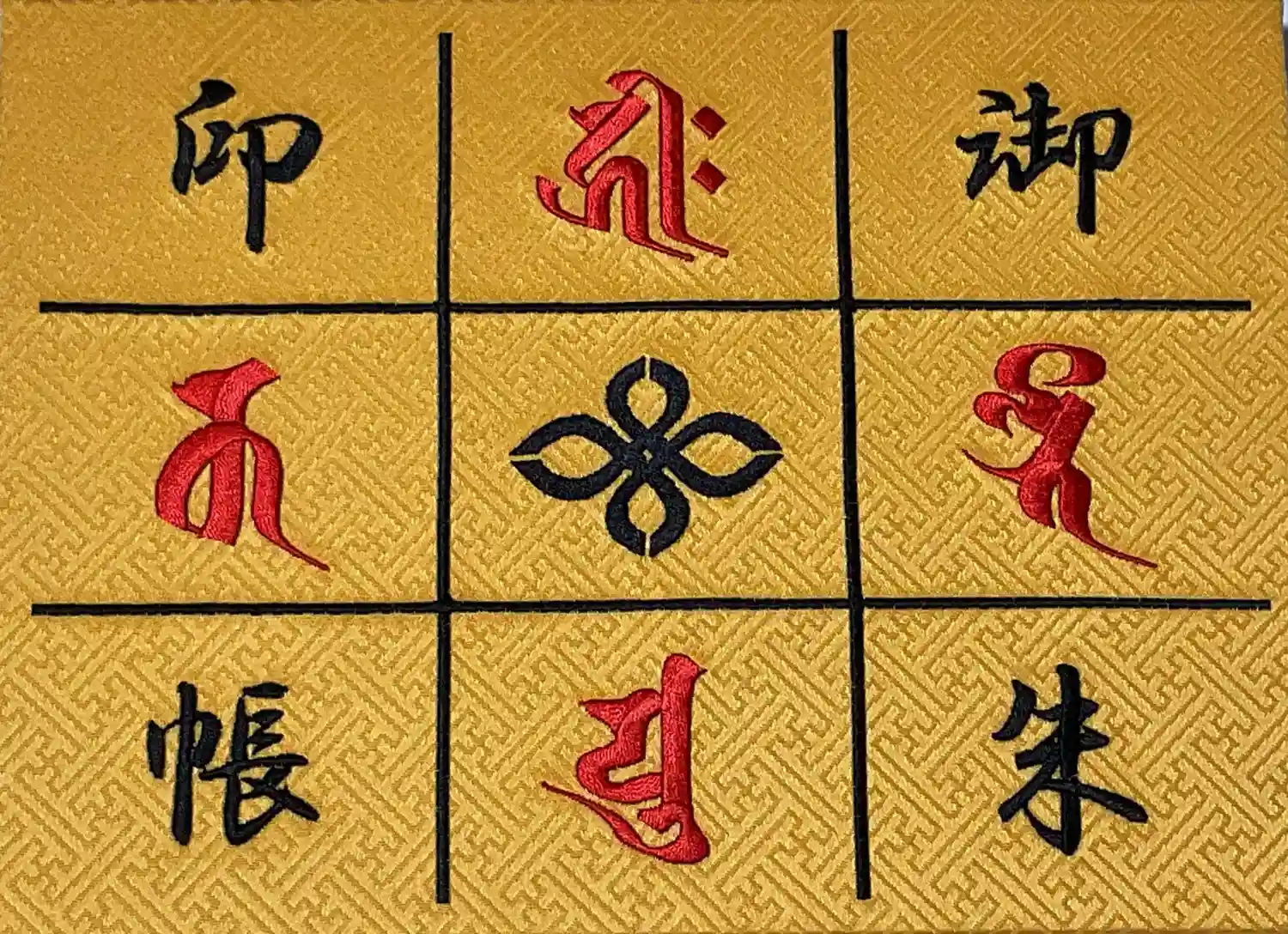 不動明王の梵字【カンマン】を赤い色であらわし、その中黒文字で【カンマン】とお書入れしてあります。