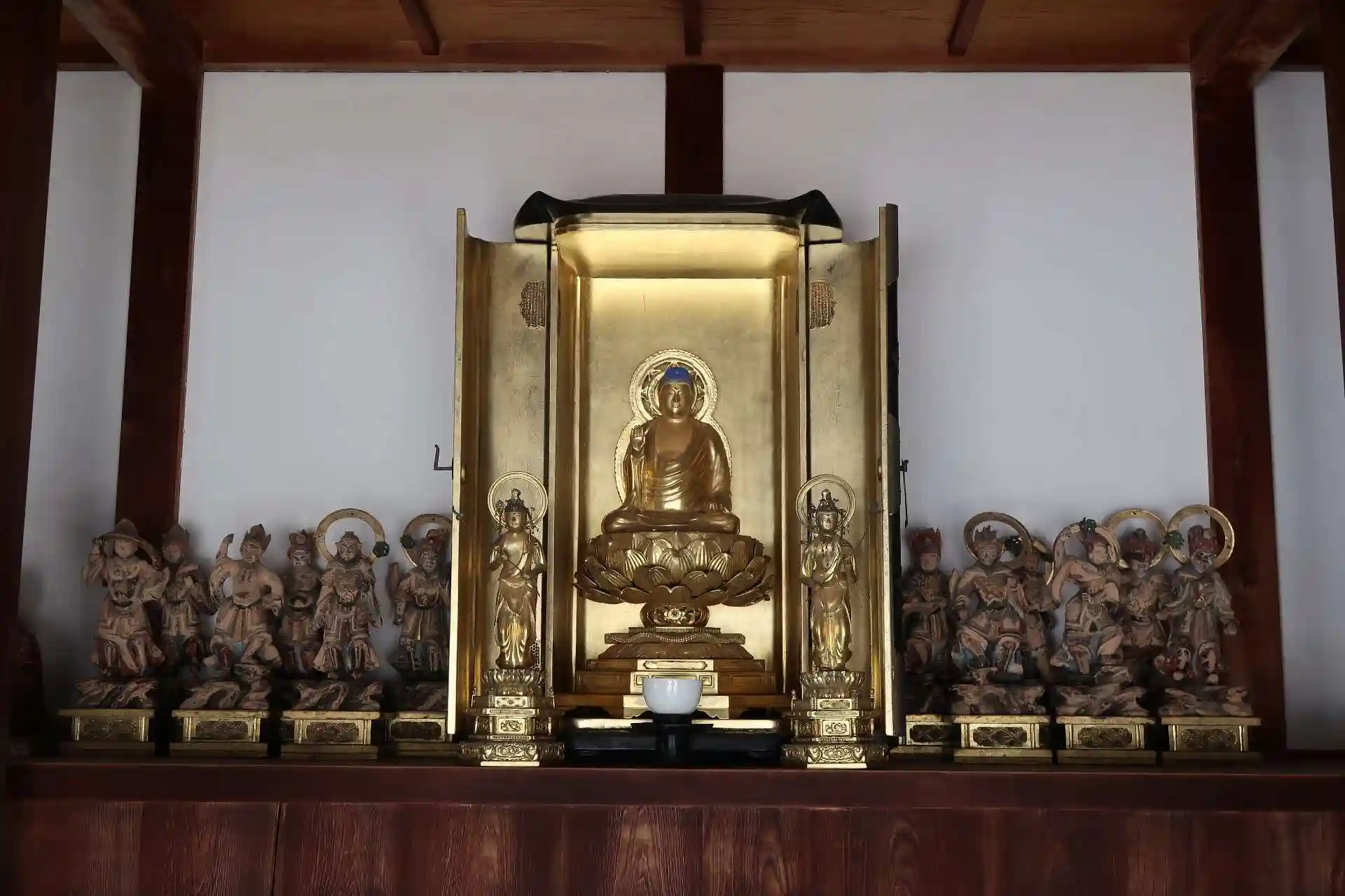 手前から薬師堂を見た時は失礼ながら納屋かなと思いましたが、近付くと金色のものが。薬師如来坐像と脇侍の日光・月光菩薩で、その両脇に十二神将でした。
