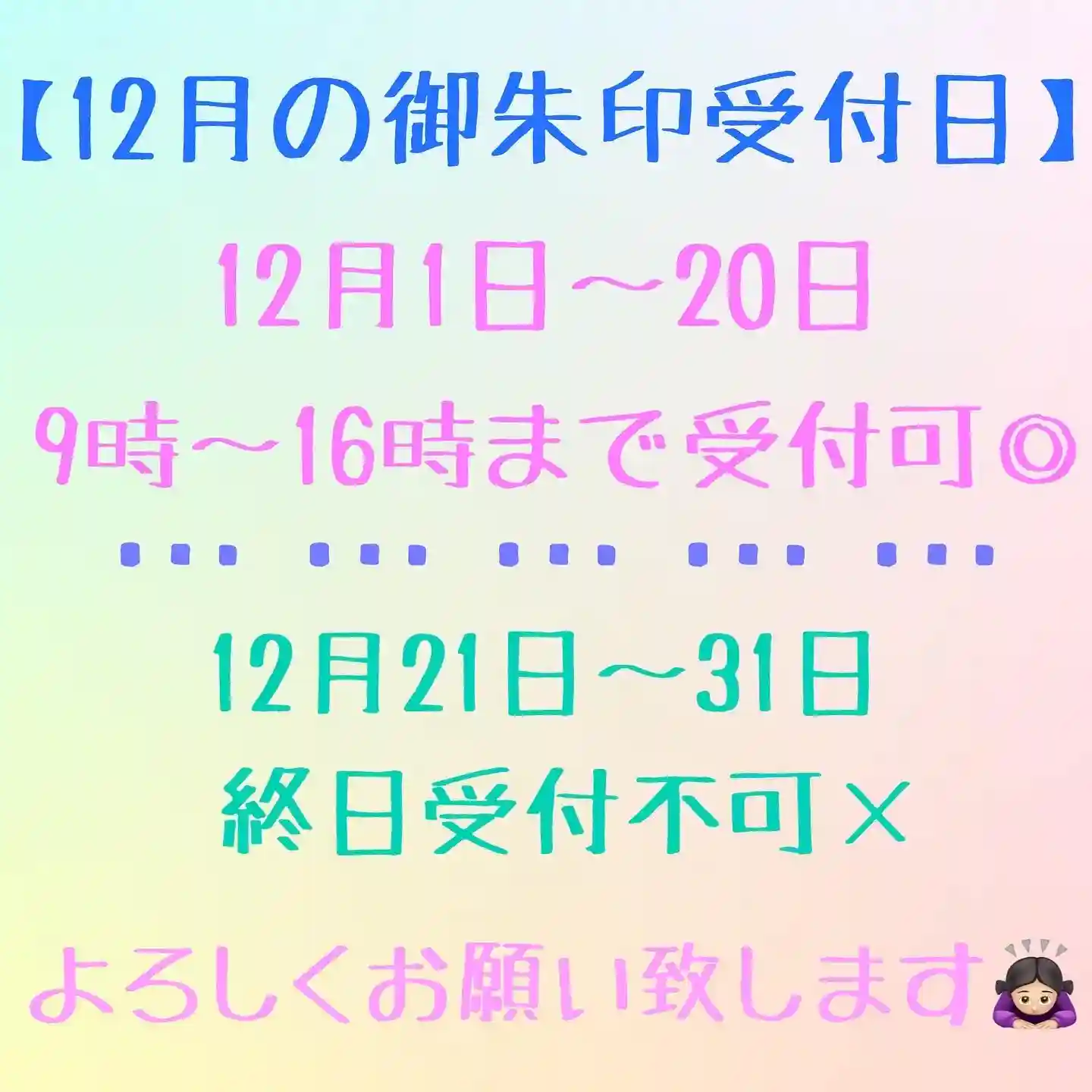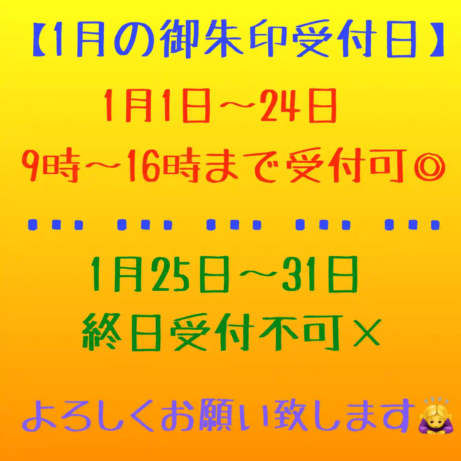 御朱印の受付対応日です。ご確認の上、ご来山下さい。