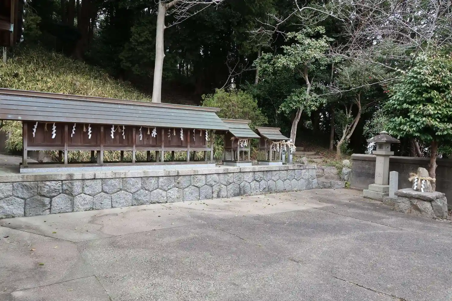 境内社は、左側から春野社、伊弉諾命、国常立命、大名持命、大日靈命、少彦名命、天御中主命。拝殿を挟んで、天津神・国津神、猿田彦命、於止與命、大己貴命、高皇産霊命、軻遇突智命、御葦社、金比羅社、明治神宮、橿原神宮。