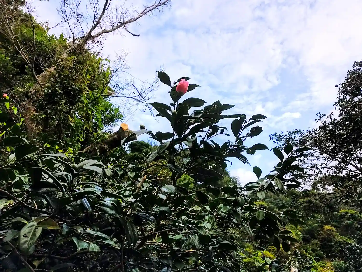 冬のころには、椿の花が庭園や裏山に開花します。
