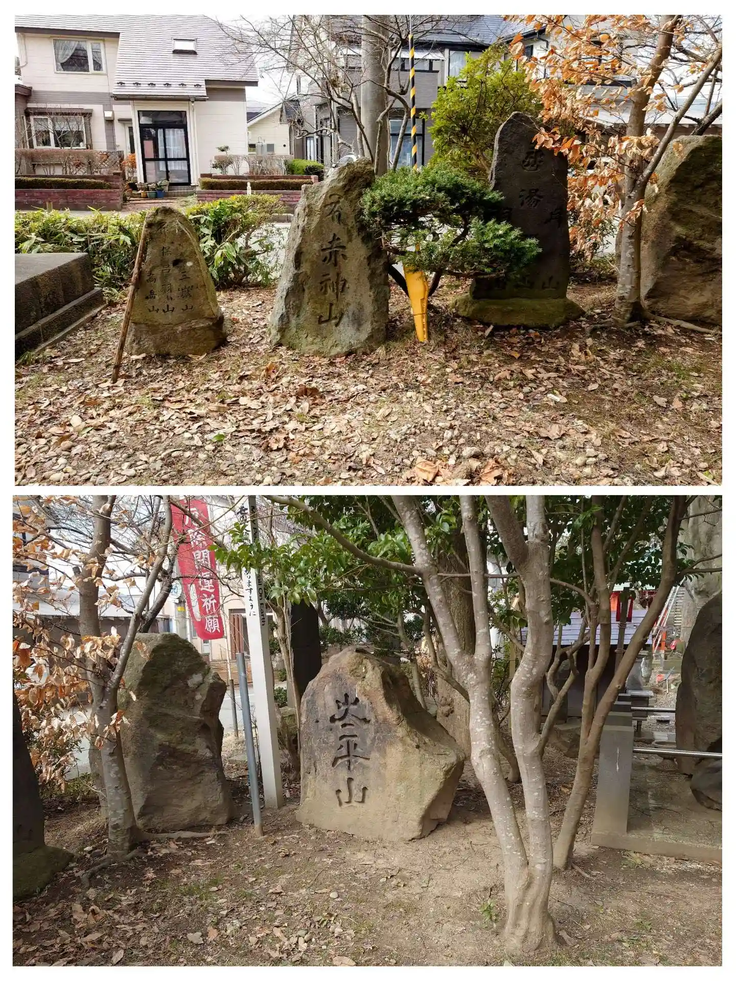 上慶應三年(1867)建立の「高岳山・保呂羽山・三嶽山」 碑・安政4年(1857)建立の「赤神山」 碑・明治二年(1869)建立の 「羽黒山湯殿山・月山」碑