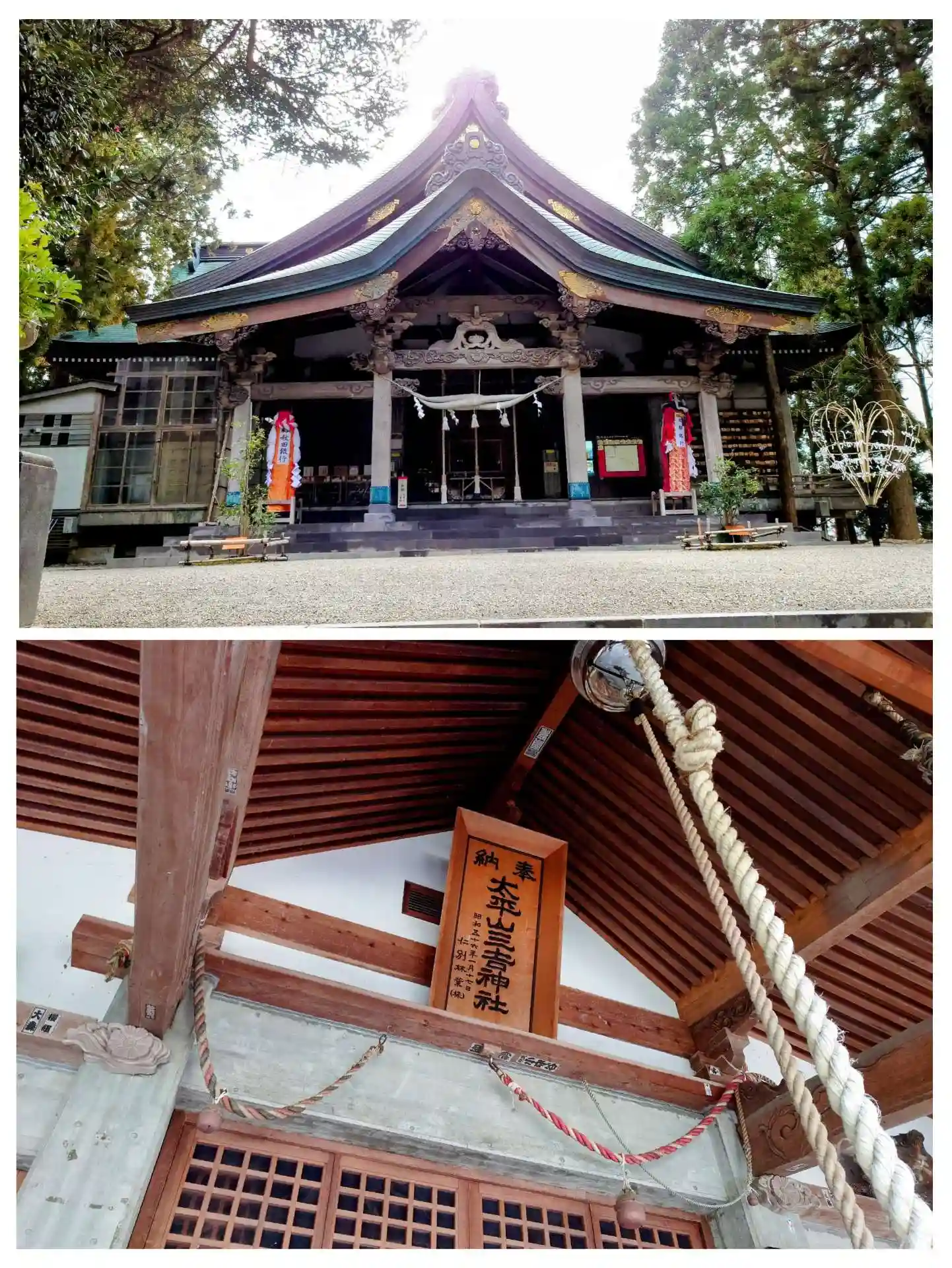 昭和五十二年(1977)建造の拝殿、屋根は大平山の姿を模したものになっているらしいのですが、大平山をまだ見ていません