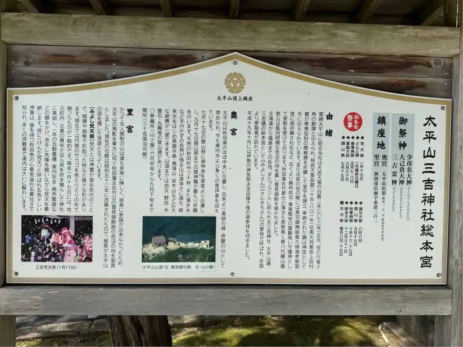 太平山三吉神社は、秋田市に鎮座する神社です。山岳信仰の対象で、太平山の麓に里宮が、山頂に奥宮があり…