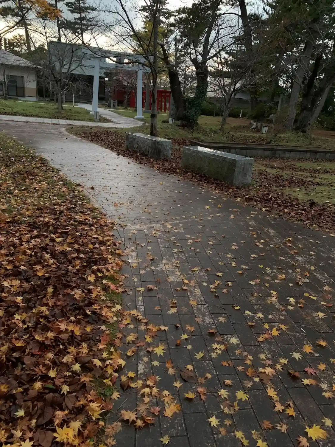 参道の濡れ落ち葉に季節の巡りを感じます