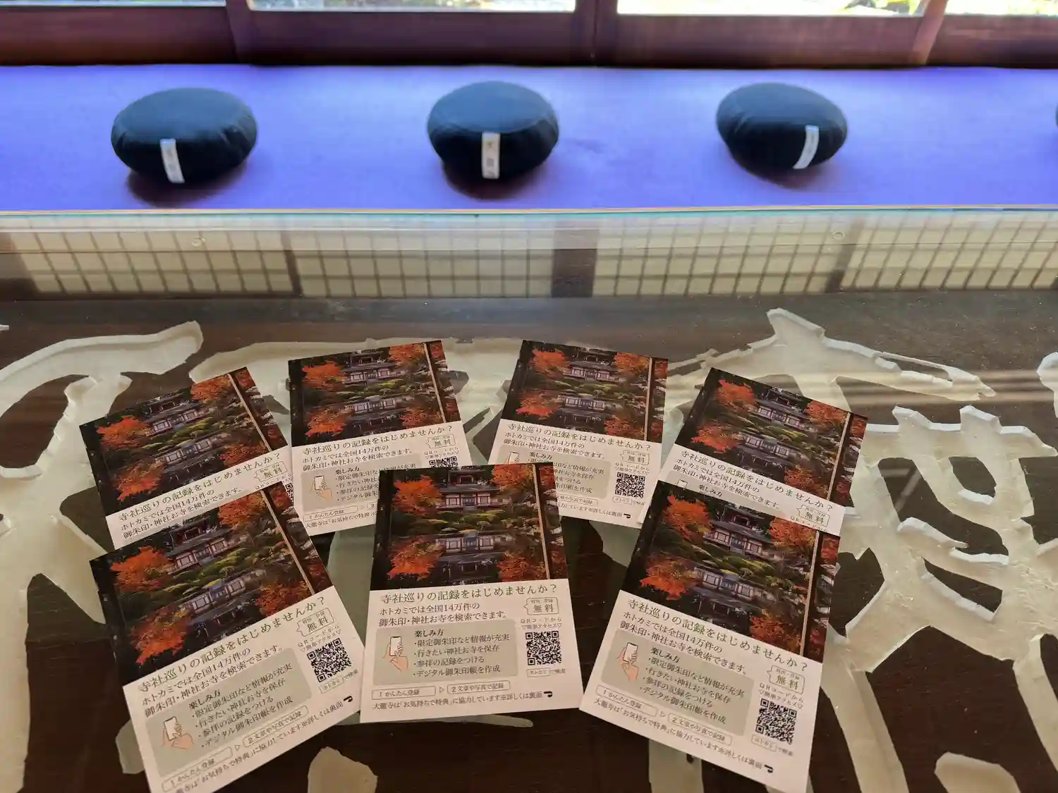 フライヤーの紅葉の写真はこの篆刻のテーブルから撮りました。紅葉の庭がテーブルのガラスに映っています。