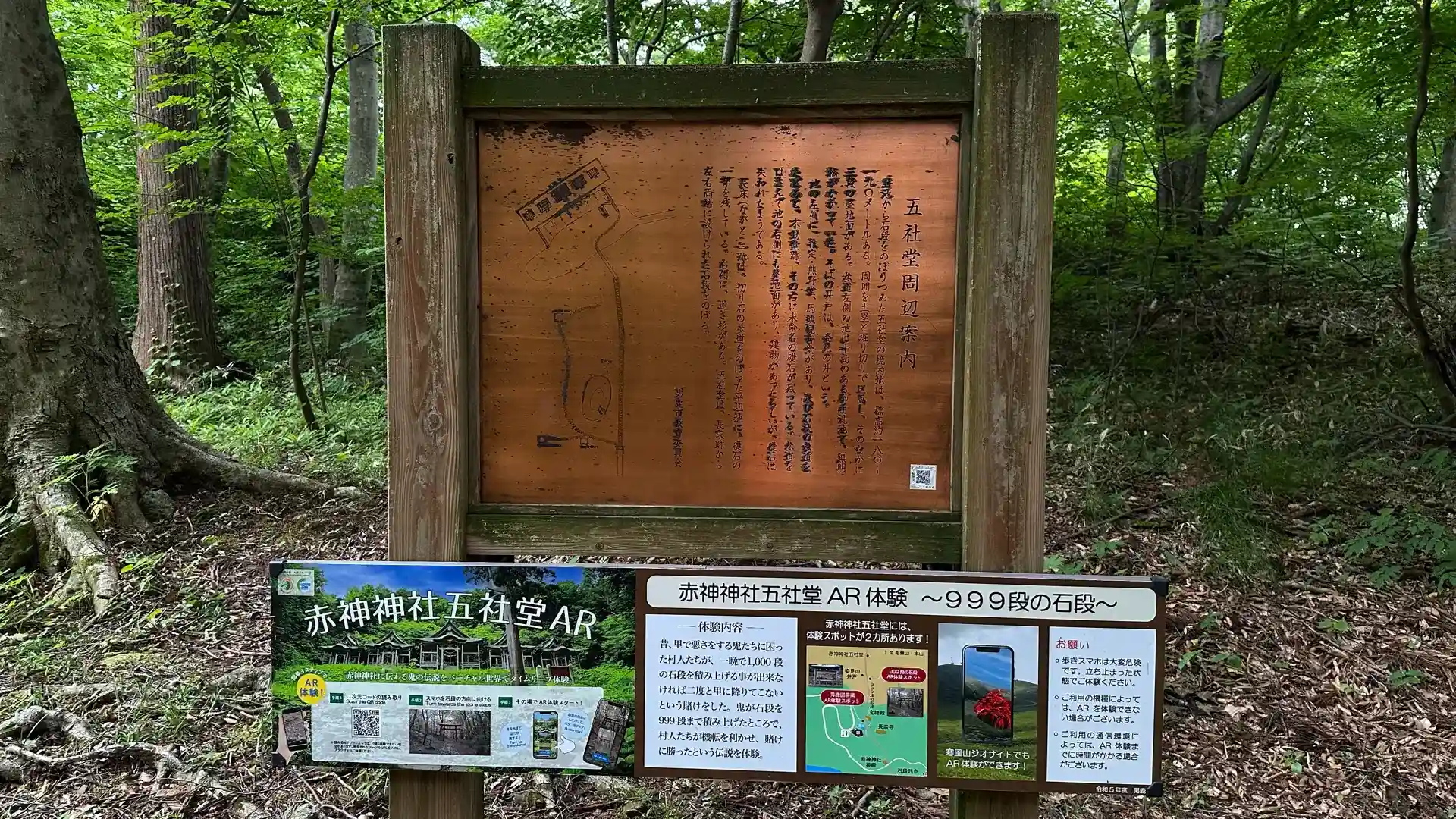 72年(景行天皇2年)(あるいは、80年(景行天皇10年)とも81年(景行天皇11年)ともいう)、赤神と称した漢の孝武帝が天から降りてきたという伝説がある。一方、縁起によると、860年(貞観2年)、慈覚大師円仁が当地に来て赤神山日積寺永禅院(永禅坊とも)を創建したのに始まり、1216年(建保4年)、比叡山の山王七社を勧請して造営されたが、うち2社が廃れたため五社堂となったとする。