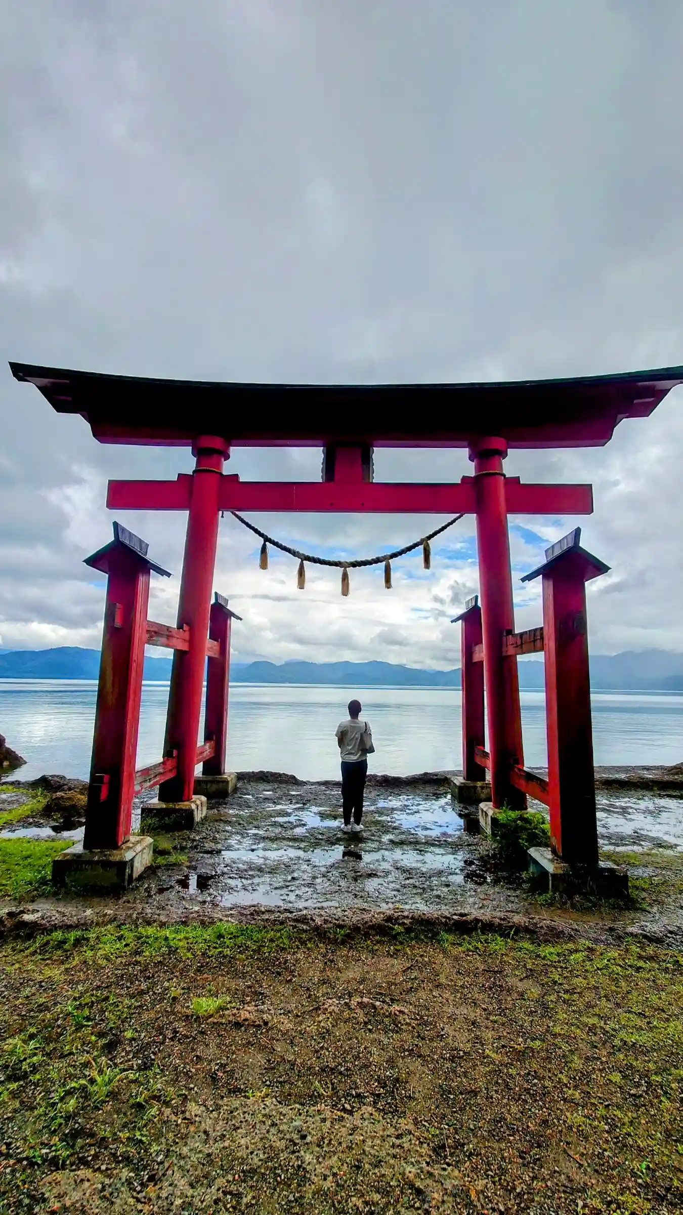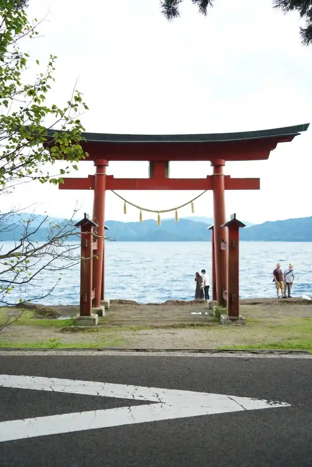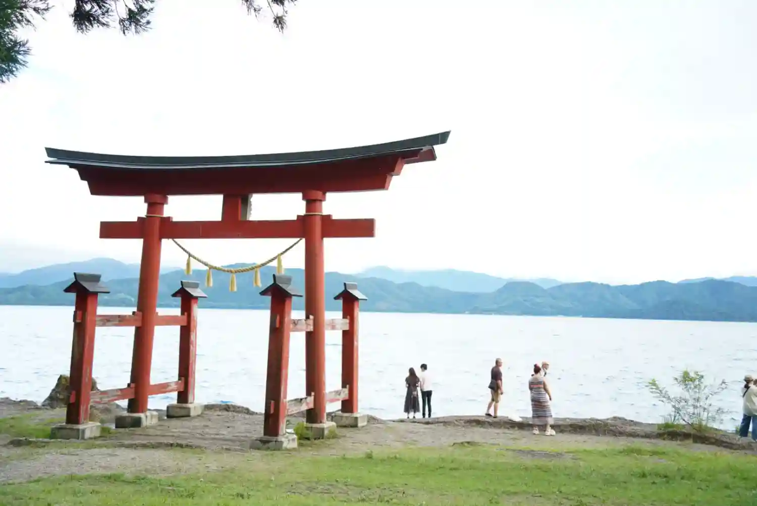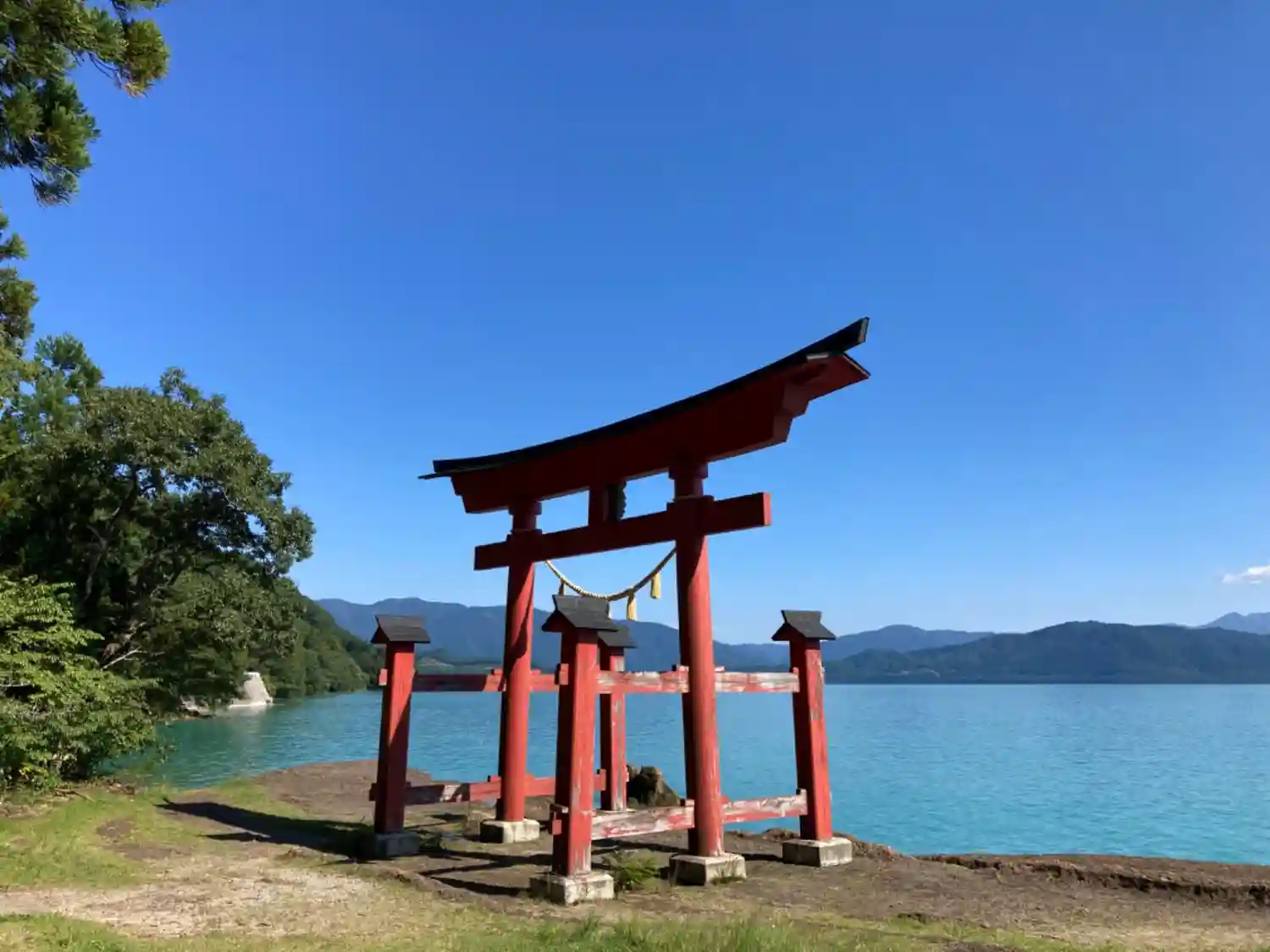 湖畔に建つ鳥居。天気の良い日は湖面の色合いも美しいです。