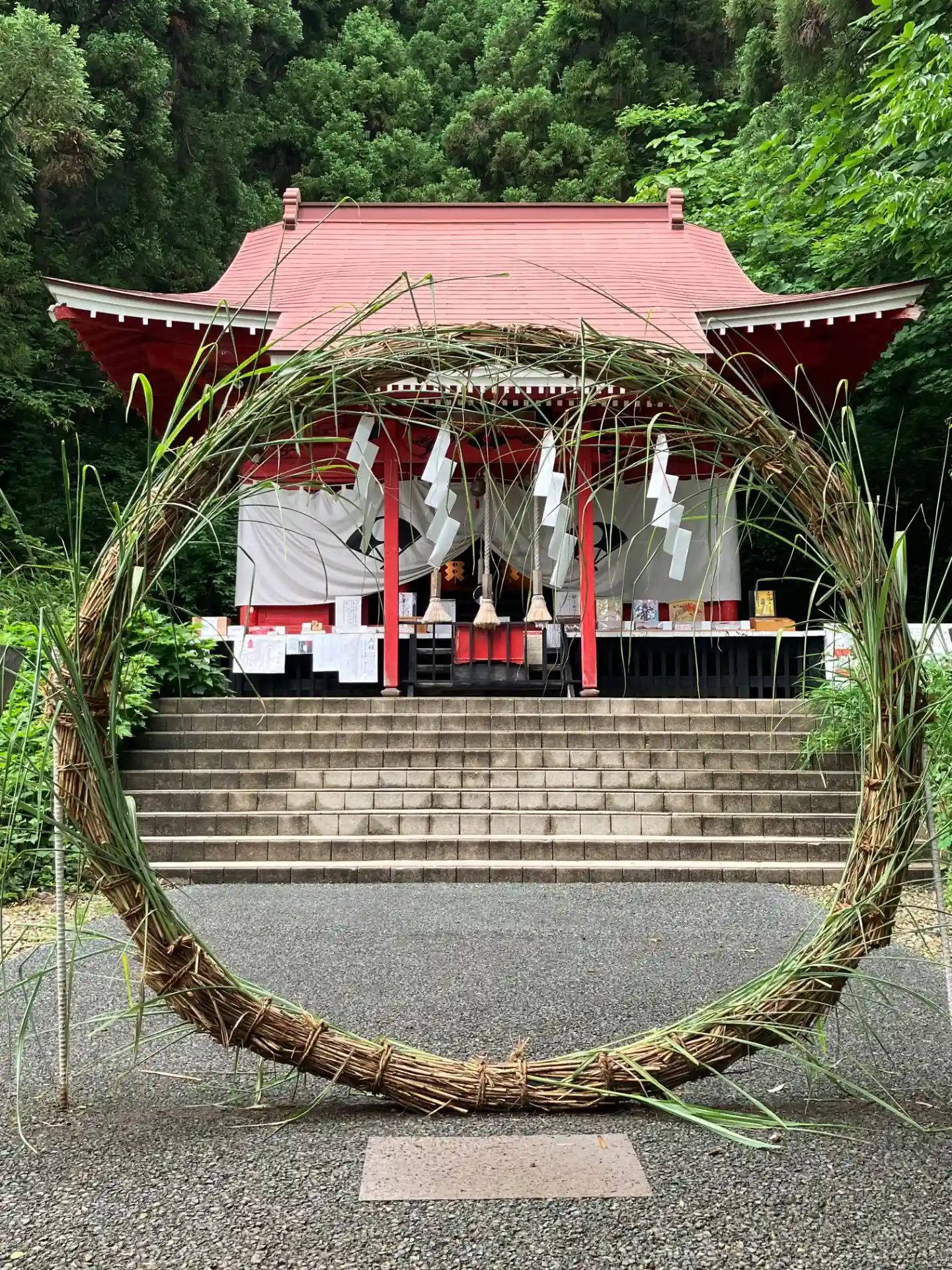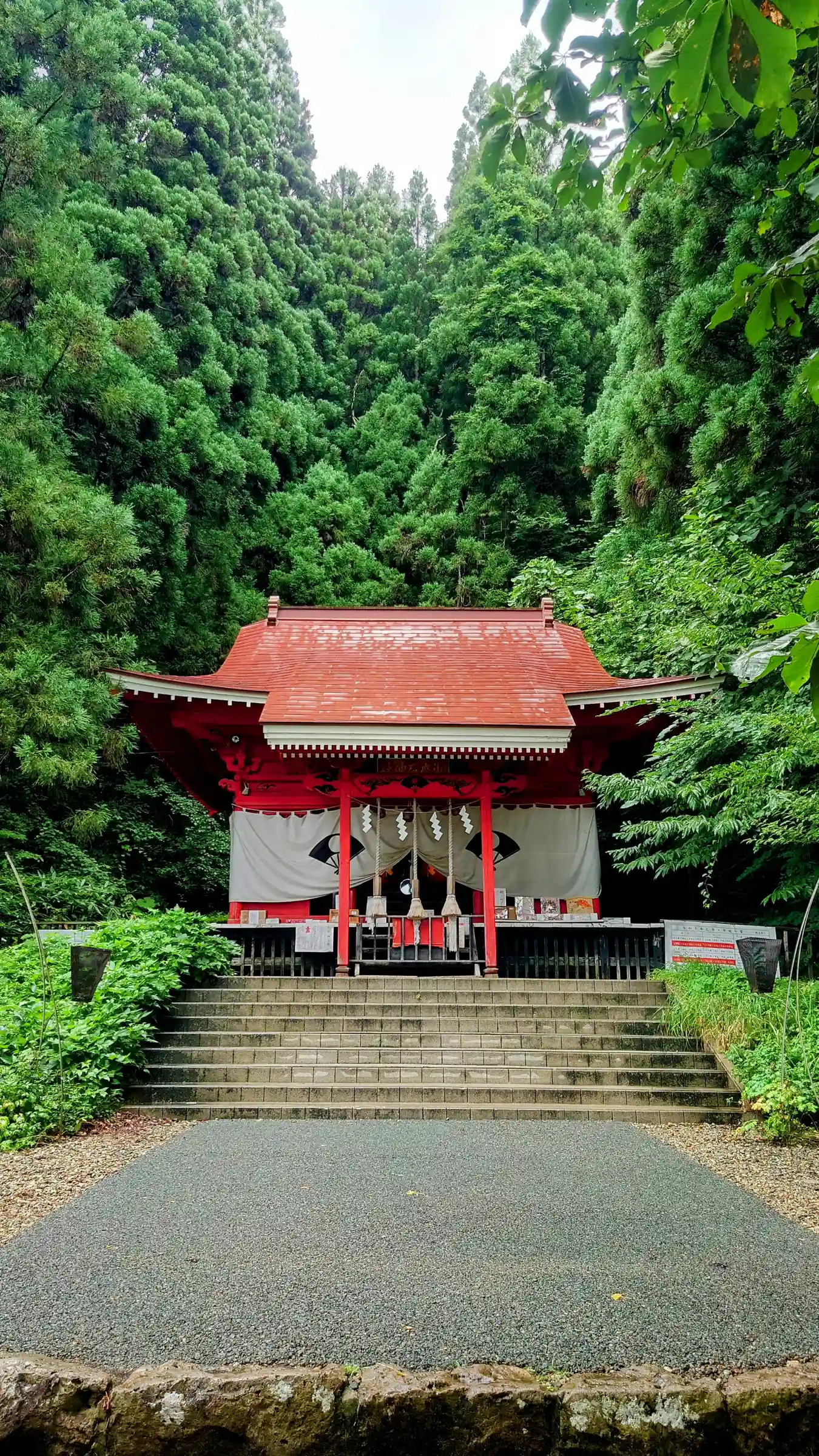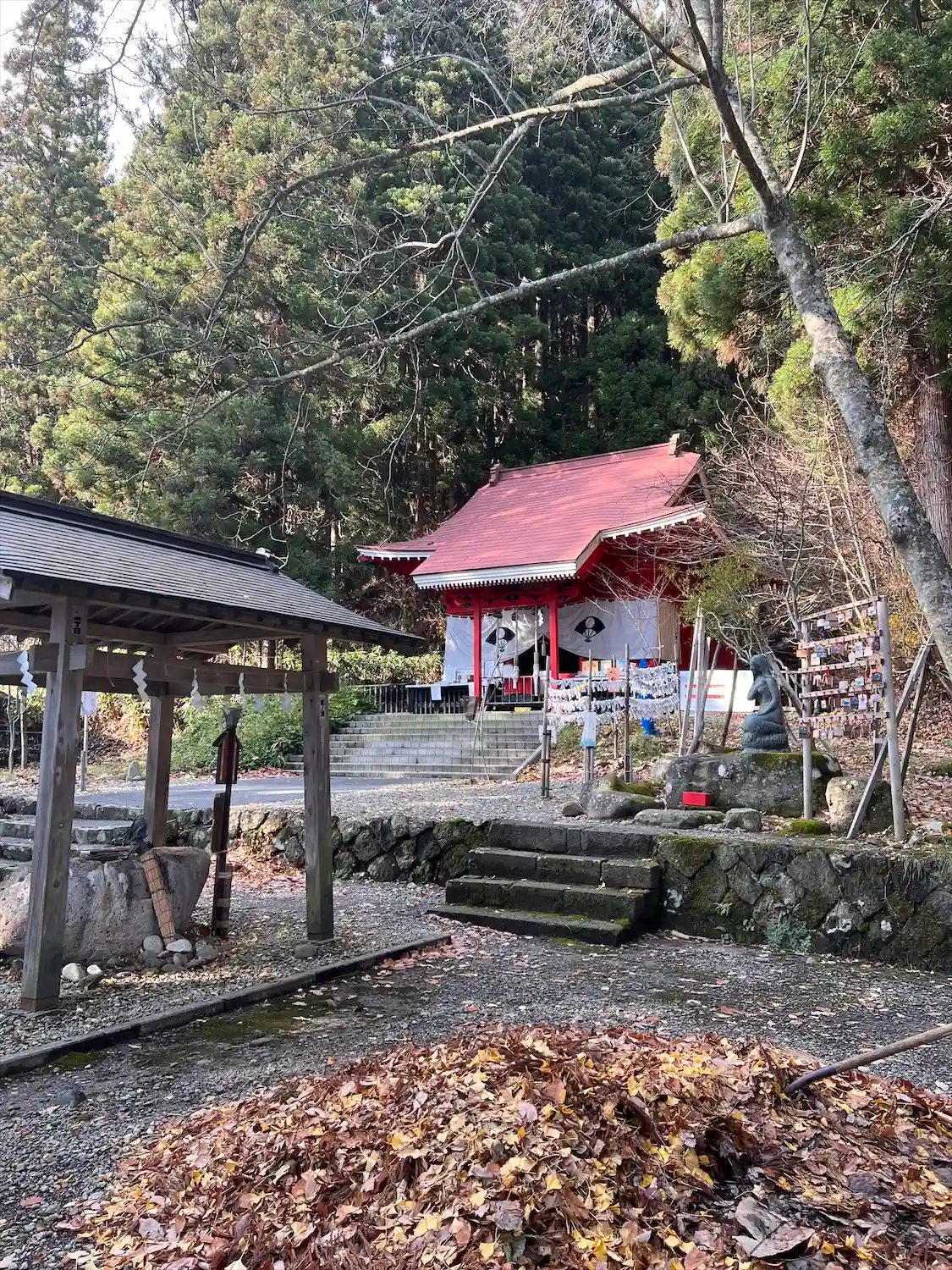 左が社務所で奥が拝殿です。拝殿側は山の緑に包まれてこれまた色味があります。