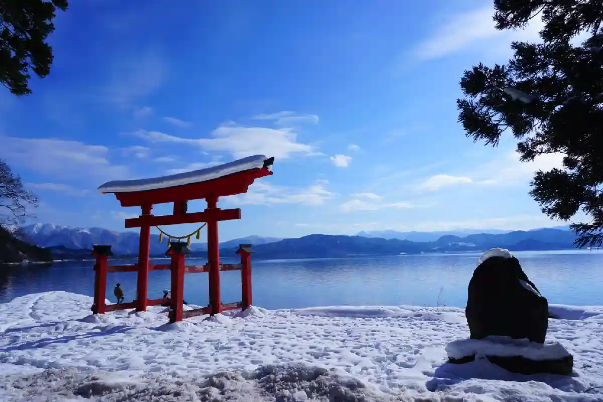 田沢湖 雪 鳥居