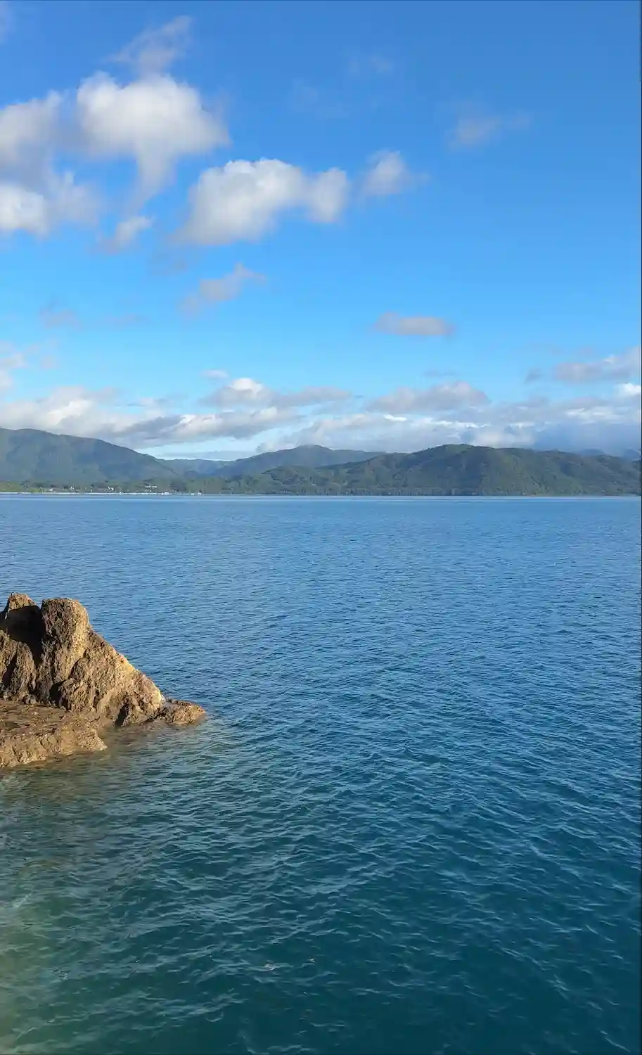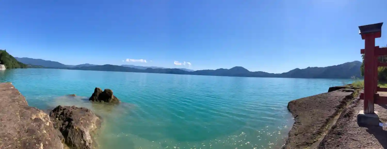 湖畔の鳥居脇からの田沢湖の眺め