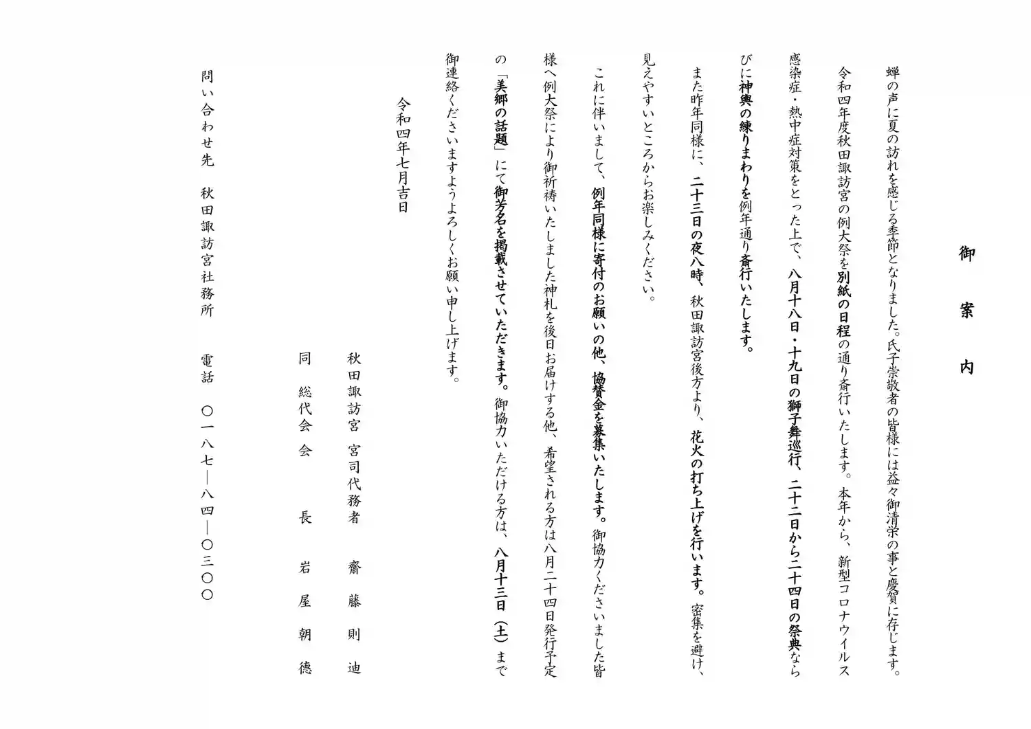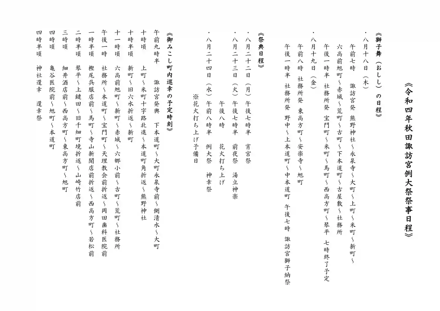 下記の通り秋田諏訪宮例大祭を斎行いたします。