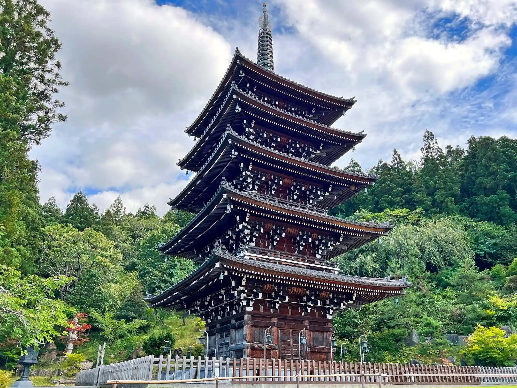 参道脇の<五重塔>。1996年建立。材質は青森ヒバを使用。高さ39mで日本第4位。