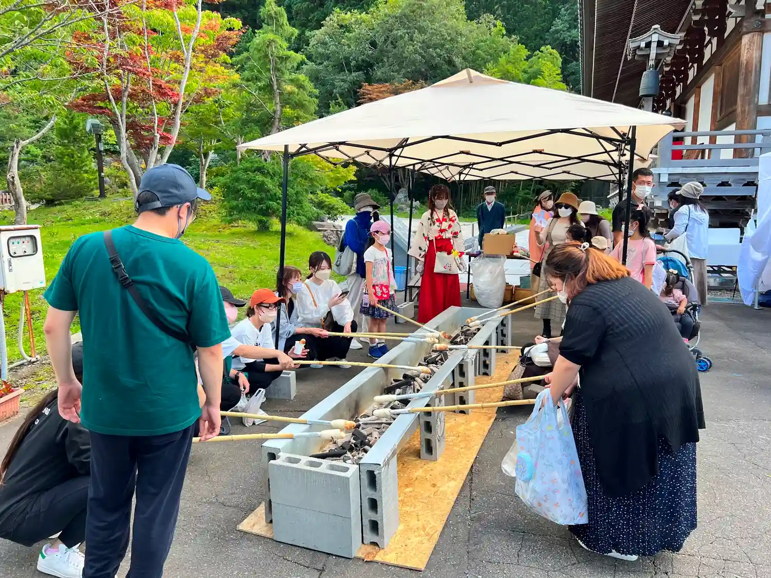 金堂の前では参加型の出店をやっていて、皆さん真剣にパンのようなものを焼いている。