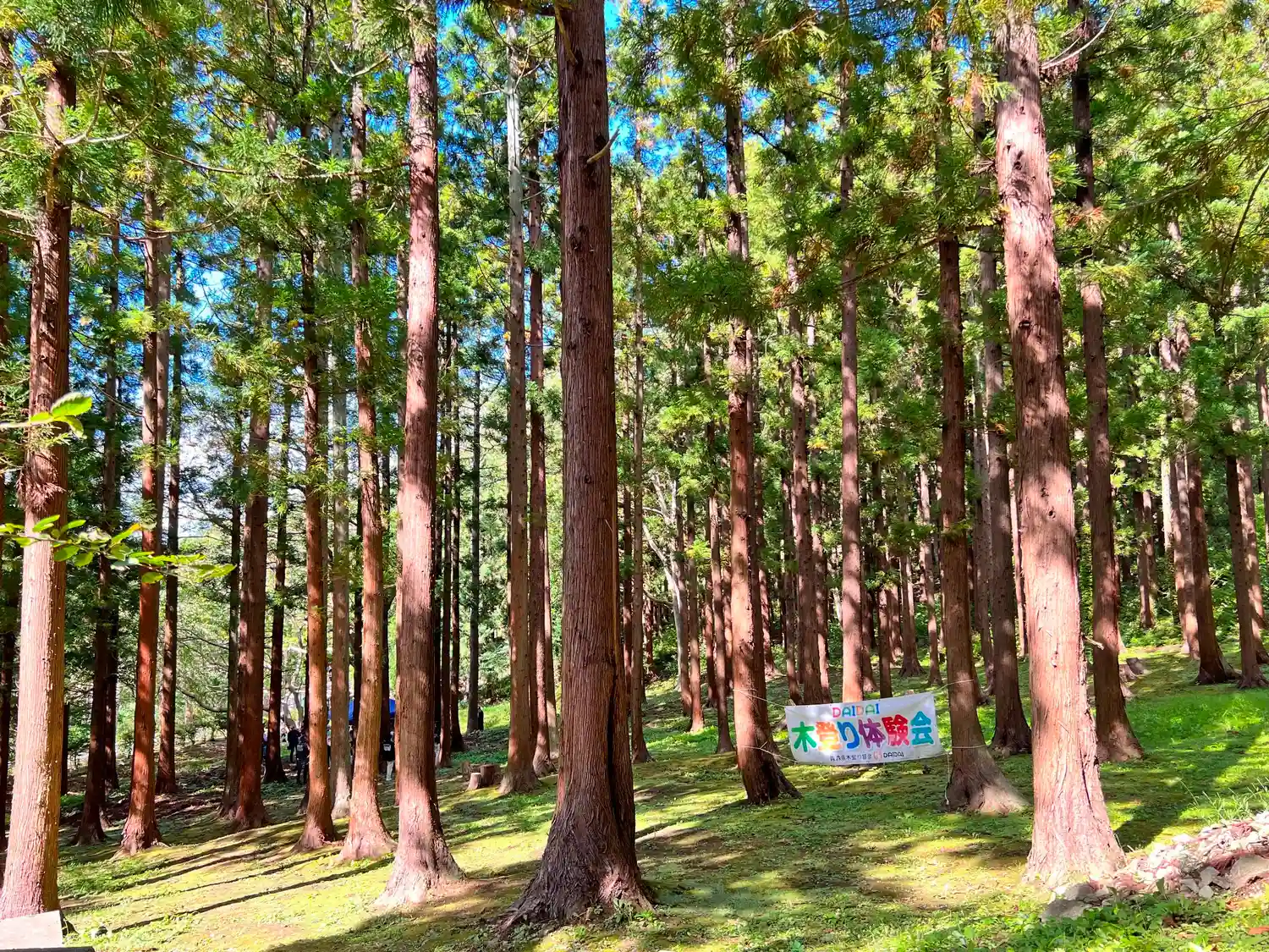 後ろの木々の間には<木登体験会>の横断幕が掛かっている。