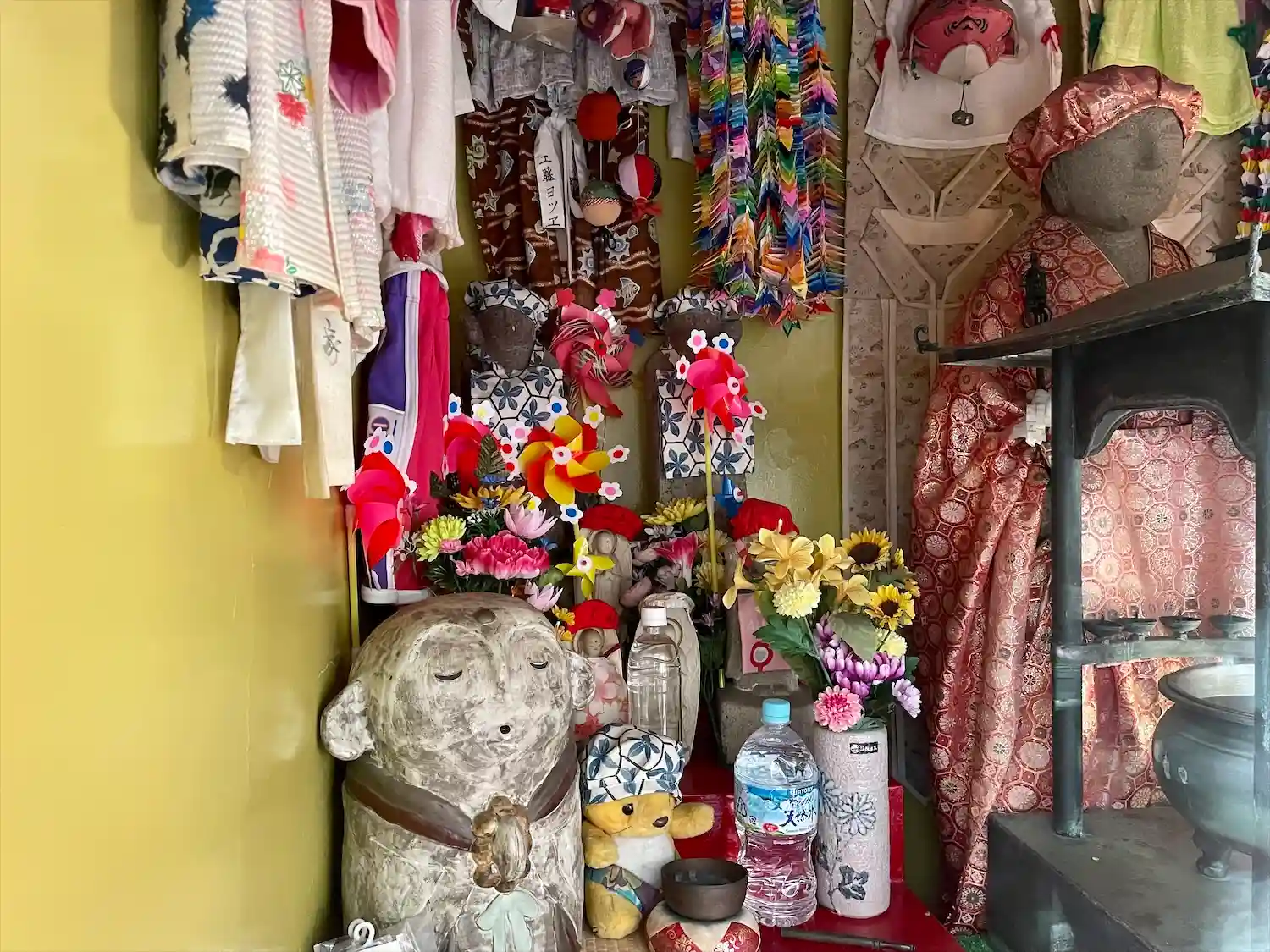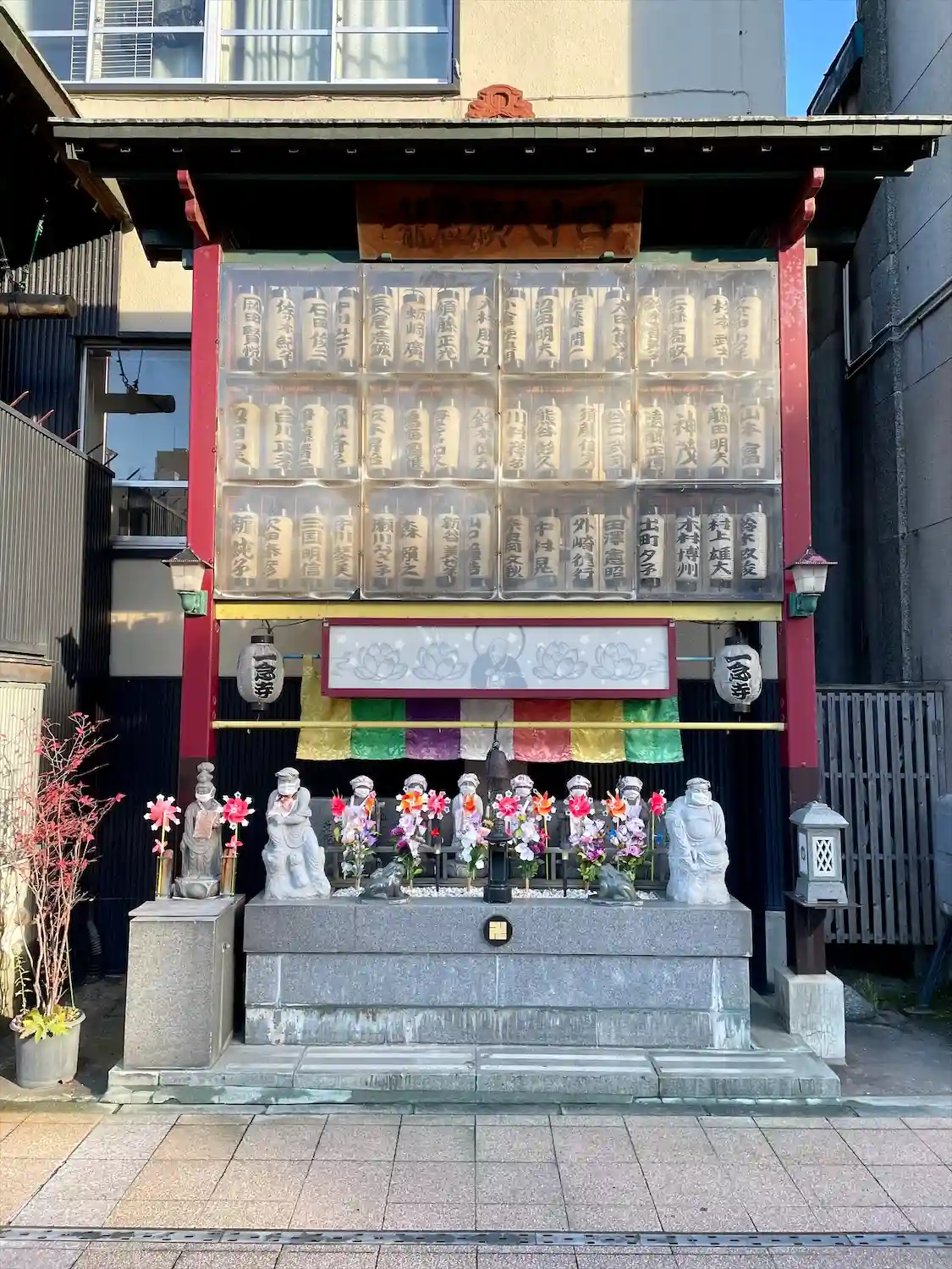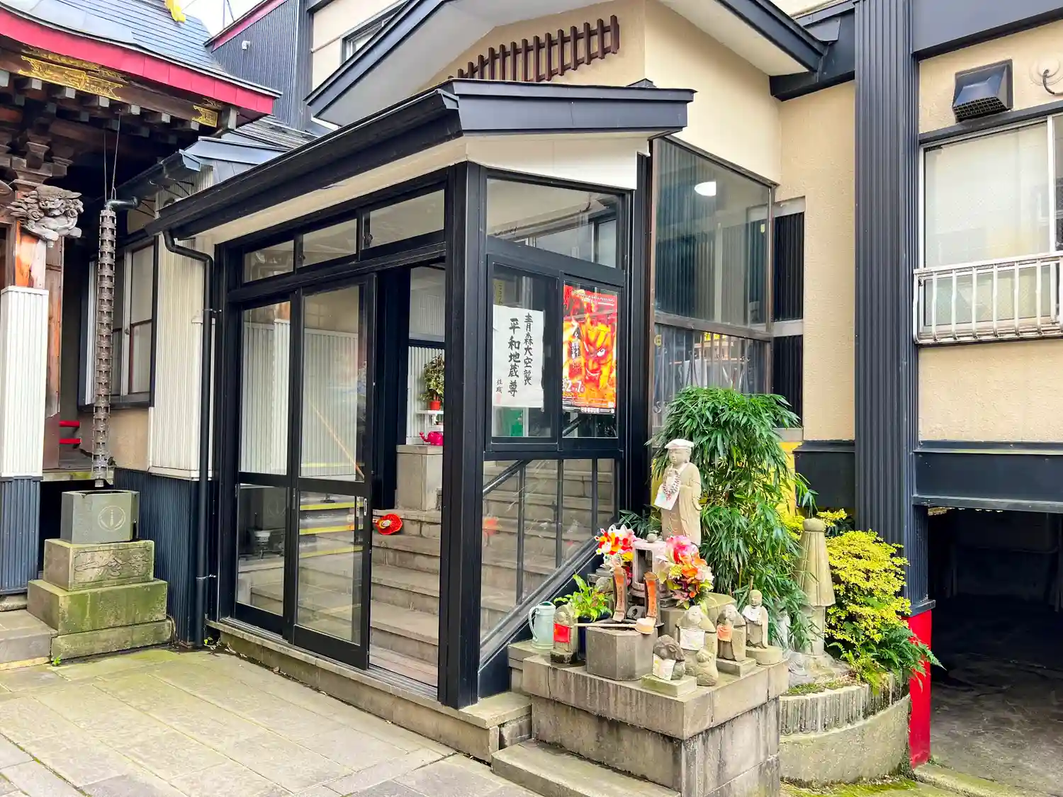 山門くぐって左側にある<地蔵尊堂>。入口の両側は絵馬掛けになっている。